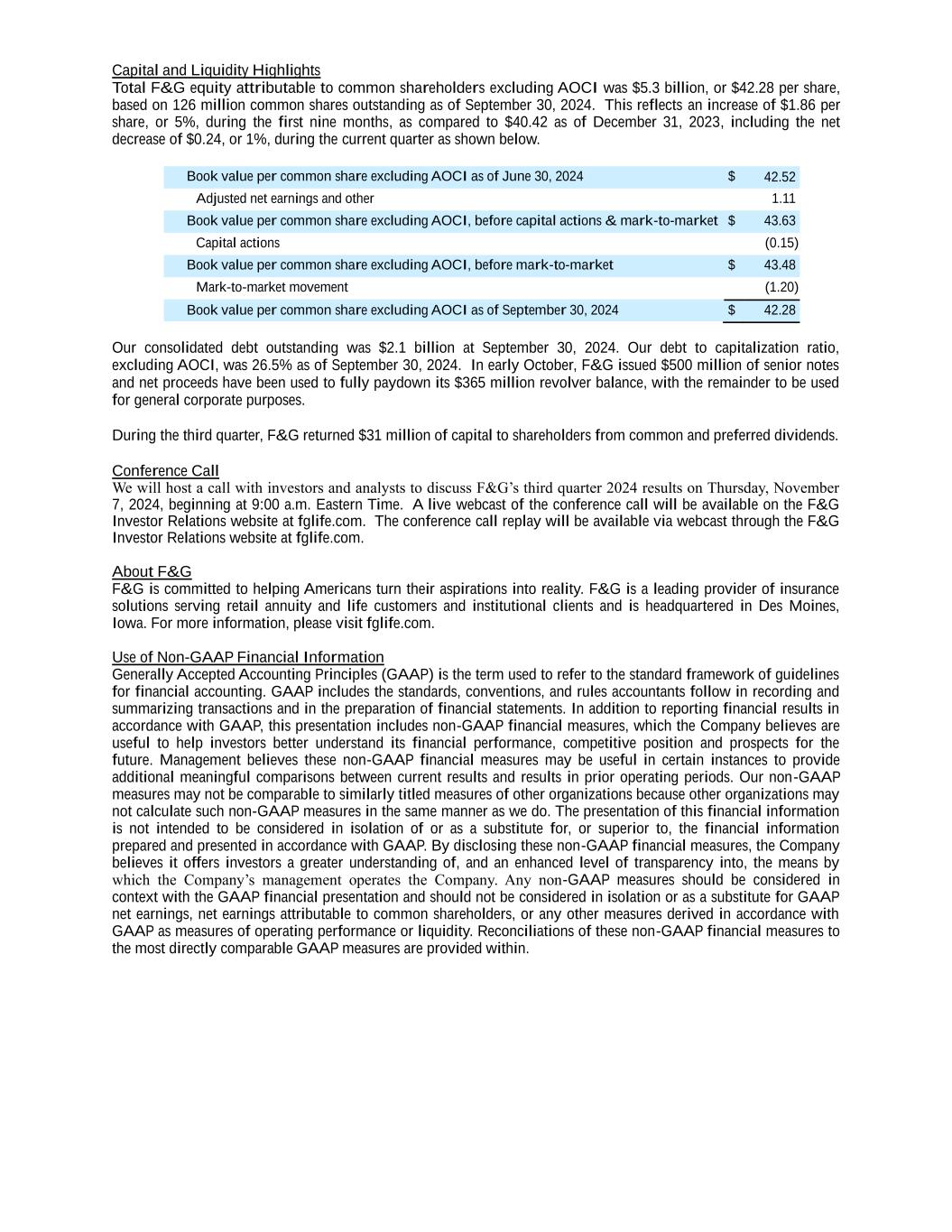 Capital and Liquidity Highlights Total F&G equity attributable to common shareholders excluding AOCI was $5.3 billion, or $42.28 per share, based on 126 million common shares outstanding as of September 30, 2024. This reflects an increase of $1.86 per share, or 5%, during the first nine months, as compared to $40.42 as of December 31, 2023, including the net decrease of $0.24, or 1%, during the current quarter as shown below. Book value per common share excluding AOCI as of June 30, 2024 $ 42.52 Adjusted net earnings and other 1.11 Book value per common share excluding AOCI, before capital actions & mark-to-market $ 43.63 Capital actions (0.15) Book value per common share excluding AOCI, before mark-to-market $ 43.48 Mark-to-market movement (1.20) Book value per common share excluding AOCI as of September 30, 2024 $ 42.28 Our consolidated debt outstanding was $2.1 billion at September 30, 2024. Our debt to capitalization ratio, excluding AOCI, was 26.5% as of September 30, 2024. In early October, F&G issued $500 million of senior notes and net proceeds have been used to fully paydown its $365 million revolver balance, with the remainder to be used for general corporate purposes. During the third quarter, F&G returned $31 million of capital to shareholders from common and preferred dividends. Conference Call We will host a call with investors and analysts to discuss F&G’s third quarter 2024 results on Thursday, November 7, 2024, beginning at 9:00 a.m. Eastern Time. A live webcast of the conference call will be available on the F&G Investor Relations website at fglife.com. The conference call replay will be available via webcast through the F&G Investor Relations website at fglife.com. About F&G F&G is committed to helping Americans turn their aspirations into reality. F&G is a leading provider of insurance solutions serving retail annuity and life customers and institutional clients and is headquartered in Des Moines, Iowa. For more information, please visit fglife.com. Use of Non-GAAP Financial Information Generally Accepted Accounting Principles (GAAP) is the term used to refer to the standard framework of guidelines for financial accounting. GAAP includes the standards, conventions, and rules accountants follow in recording and summarizing transactions and in the preparation of financial statements. In addition to reporting financial results in accordance with GAAP, this presentation includes non-GAAP financial measures, which the Company believes are useful to help investors better understand its financial performance, competitive position and prospects for the future. Management believes these non-GAAP financial measures may be useful in certain instances to provide additional meaningful comparisons between current results and results in prior operating periods. Our non-GAAP measures may not be comparable to similarly titled measures of other organizations because other organizations may not calculate such non-GAAP measures in the same manner as we do. The presentation of this financial information is not intended to be considered in isolation of or as a substitute for, or superior to, the financial information prepared and presented in accordance with GAAP. By disclosing these non-GAAP financial measures, the Company believes it offers investors a greater understanding of, and an enhanced level of transparency into, the means by which the Company’s management operates the Company. Any non-GAAP measures should be considered in context with the GAAP financial presentation and should not be considered in isolation or as a substitute for GAAP net earnings, net earnings attributable to common shareholders, or any other measures derived in accordance with GAAP as measures of operating performance or liquidity. Reconciliations of these non-GAAP financial measures to the most directly comparable GAAP measures are provided within.