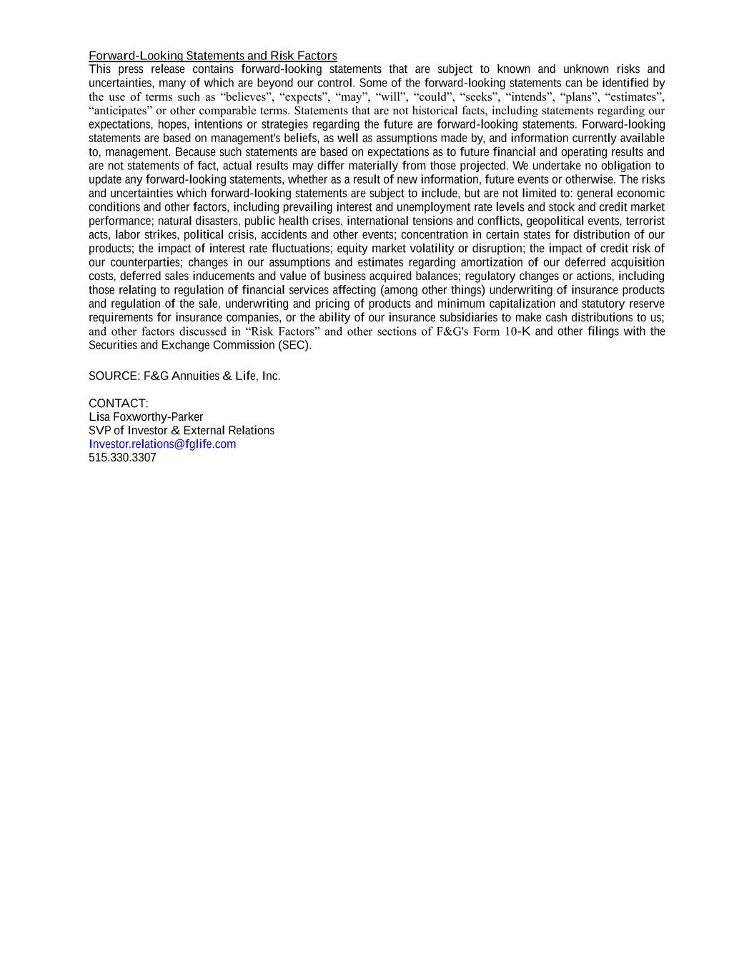 Forward-Looking Statements and Risk Factors This press release contains forward-looking statements that are subject to known and unknown risks and uncertainties, many of which are beyond our control. Some of the forward-looking statements can be identified by the use of terms such as “believes”, “expects”, “may”, “will”, “could”, “seeks”, “intends”, “plans”, “estimates”, “anticipates” or other comparable terms. Statements that are not historical facts, including statements regarding our expectations, hopes, intentions or strategies regarding the future are forward-looking statements. Forward-looking statements are based on management's beliefs, as well as assumptions made by, and information currently available to, management. Because such statements are based on expectations as to future financial and operating results and are not statements of fact, actual results may differ materially from those projected. We undertake no obligation to update any forward-looking statements, whether as a result of new information, future events or otherwise. The risks and uncertainties which forward-looking statements are subject to include, but are not limited to: general economic conditions and other factors, including prevailing interest and unemployment rate levels and stock and credit market performance; natural disasters, public health crises, international tensions and conflicts, geopolitical events, terrorist acts, labor strikes, political crisis, accidents and other events; concentration in certain states for distribution of our products; the impact of interest rate fluctuations; equity market volatility or disruption; the impact of credit risk of our counterparties; changes in our assumptions and estimates regarding amortization of our deferred acquisition costs, deferred sales inducements and value of business acquired balances; regulatory changes or actions, including those relating to regulation of financial services affecting (among other things) underwriting of insurance products and regulation of the sale, underwriting and pricing of products and minimum capitalization and statutory reserve requirements for insurance companies, or the ability of our insurance subsidiaries to make cash distributions to us; and other factors discussed in “Risk Factors” and other sections of F&G's Form 10-K and other filings with the Securities and Exchange Commission (SEC). SOURCE: F&G Annuities & Life, Inc. CONTACT: Lisa Foxworthy-Parker SVP of Investor & External Relations Investor.relations@fglife.com 515.330.3307