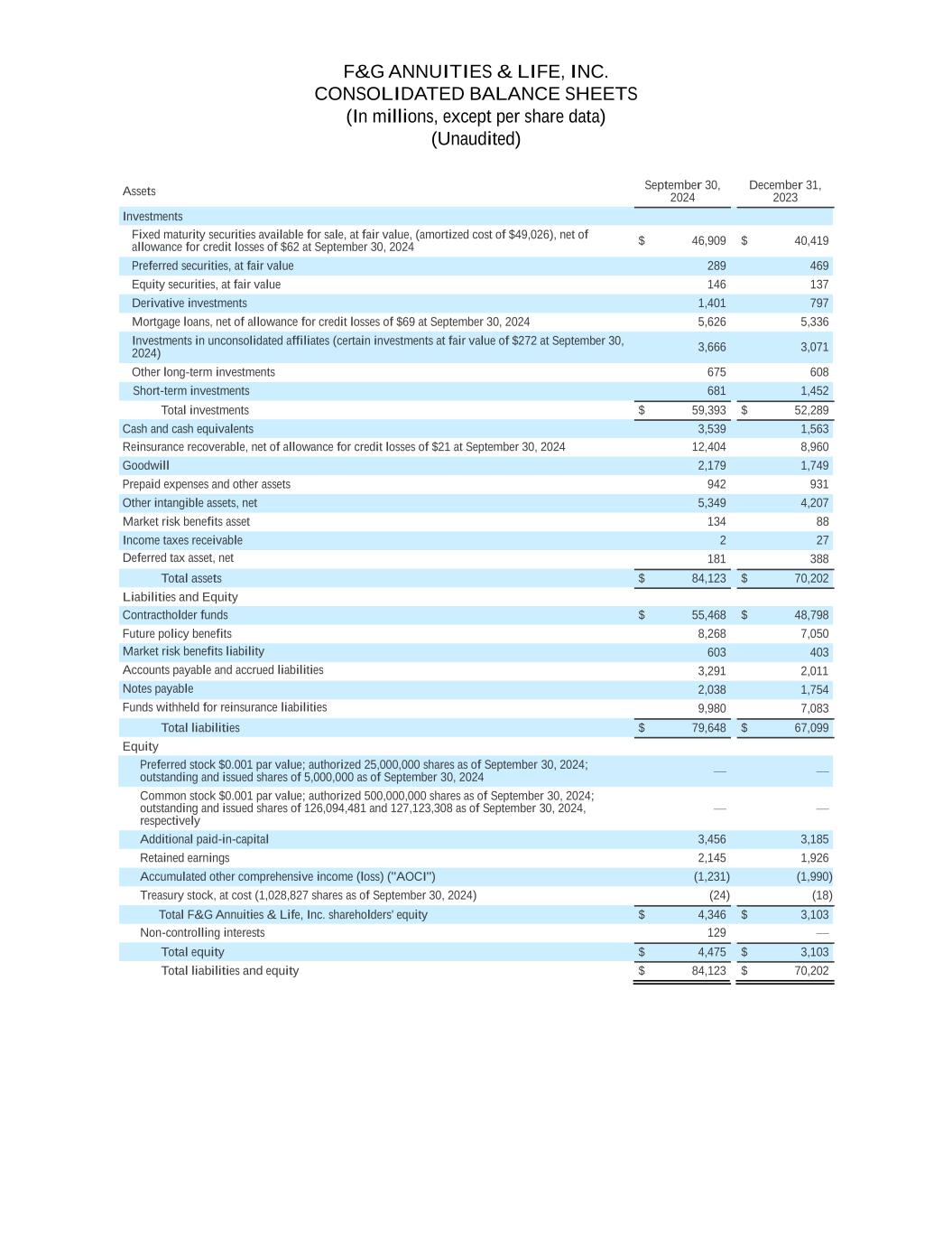 F&G ANNUITIES & LIFE, INC. CONSOLIDATED BALANCE SHEETS (In millions, except per share data) (Unaudited) Assets September 30, 2024 December 31, 2023 Investments Fixed maturity securities available for sale, at fair value, (amortized cost of $49,026), net of allowance for credit losses of $62 at September 30, 2024 $ 46,909 $ 40,419 Preferred securities, at fair value 289 469 Equity securities, at fair value 146 137 Derivative investments 1,401 797 Mortgage loans, net of allowance for credit losses of $69 at September 30, 2024 5,626 5,336 Investments in unconsolidated affiliates (certain investments at fair value of $272 at September 30, 2024) 3,666 3,071 Other long-term investments 675 608 Short-term investments 681 1,452 Total investments $ 59,393 $ 52,289 Cash and cash equivalents 3,539 1,563 Reinsurance recoverable, net of allowance for credit losses of $21 at September 30, 2024 12,404 8,960 Goodwill 2,179 1,749 Prepaid expenses and other assets 942 931 Other intangible assets, net 5,349 4,207 Market risk benefits asset 134 88 Income taxes receivable 2 27 Deferred tax asset, net 181 388 Total assets $ 84,123 $ 70,202 Liabilities and Equity Contractholder funds $ 55,468 $ 48,798 Future policy benefits 8,268 7,050 Market risk benefits liability 603 403 Accounts payable and accrued liabilities 3,291 2,011 Notes payable 2,038 1,754 Funds withheld for reinsurance liabilities 9,980 7,083 Total liabilities $ 79,648 $ 67,099 Equity Preferred stock $0.001 par value; authorized 25,000,000 shares as of September 30, 2024; outstanding and issued shares of 5,000,000 as of September 30, 2024 — — Common stock $0.001 par value; authorized 500,000,000 shares as of September 30, 2024; outstanding and issued shares of 126,094,481 and 127,123,308 as of September 30, 2024, respectively — — Additional paid-in-capital 3,456 3,185 Retained earnings 2,145 1,926 Accumulated other comprehensive income (loss) ("AOCI") (1,231) (1,990) Treasury stock, at cost (1,028,827 shares as of September 30, 2024) (24) (18) Total F&G Annuities & Life, Inc. shareholders' equity $ 4,346 $ 3,103 Non-controlling interests 129 — Total equity $ 4,475 $ 3,103 Total liabilities and equity $ 84,123 $ 70,202