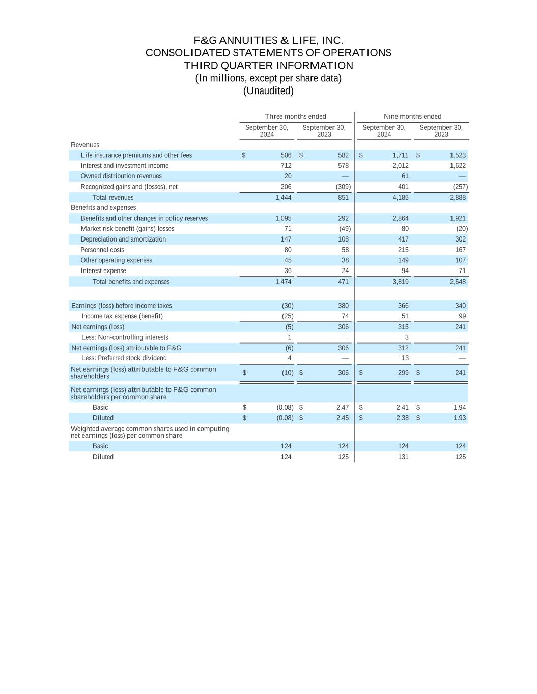 F&G ANNUITIES & LIFE, INC. CONSOLIDATED STATEMENTS OF OPERATIONS THIRD QUARTER INFORMATION (In millions, except per share data) (Unaudited) Three months ended Nine months ended September 30, 2024 September 30, 2023 September 30, 2024 September 30, 2023 Revenues Life insurance premiums and other fees $ 506 $ 582 $ 1,711 $ 1,523 Interest and investment income 712 578 2,012 1,622 Owned distribution revenues 20 — 61 — Recognized gains and (losses), net 206 (309) 401 (257) Total revenues 1,444 851 4,185 2,888 Benefits and expenses Benefits and other changes in policy reserves 1,095 292 2,864 1,921 Market risk benefit (gains) losses 71 (49) 80 (20) Depreciation and amortization 147 108 417 302 Personnel costs 80 58 215 167 Other operating expenses 45 38 149 107 Interest expense 36 24 94 71 Total benefits and expenses 1,474 471 3,819 2,548 Earnings (loss) before income taxes (30) 380 366 340 Income tax expense (benefit) (25) 74 51 99 Net earnings (loss) (5) 306 315 241 Less: Non-controlling interests 1 — 3 — Net earnings (loss) attributable to F&G (6) 306 312 241 Less: Preferred stock dividend 4 — 13 — Net earnings (loss) attributable to F&G common shareholders $ (10) $ 306 $ 299 $ 241 Net earnings (loss) attributable to F&G common shareholders per common share Basic $ (0.08) $ 2.47 $ 2.41 $ 1.94 Diluted $ (0.08) $ 2.45 $ 2.38 $ 1.93 Weighted average common shares used in computing net earnings (loss) per common share Basic 124 124 124 124 Diluted 124 125 131 125