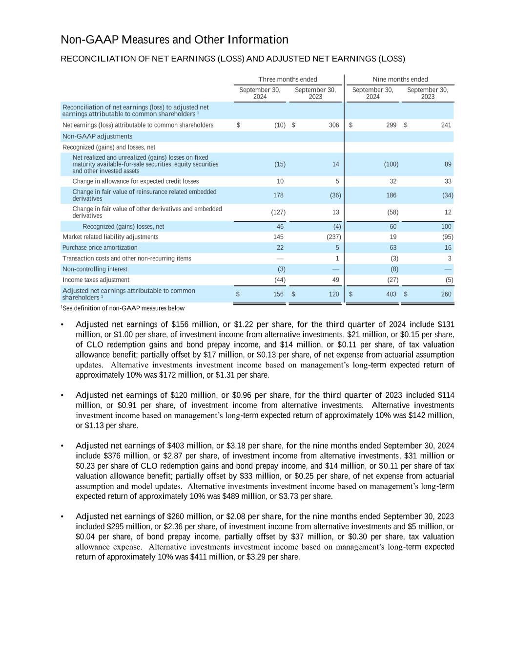 Non-GAAP Measures and Other Information RECONCILIATION OF NET EARNINGS (LOSS) AND ADJUSTED NET EARNINGS (LOSS) Three months ended Nine months ended September 30, 2024 September 30, 2023 September 30, 2024 September 30, 2023 Reconciliation of net earnings (loss) to adjusted net earnings attributable to common shareholders ¹ Net earnings (loss) attributable to common shareholders $ (10) $ 306 $ 299 $ 241 Non-GAAP adjustments Recognized (gains) and losses, net Net realized and unrealized (gains) losses on fixed maturity available-for-sale securities, equity securities and other invested assets (15) 14 (100) 89 Change in allowance for expected credit losses 10 5 32 33 Change in fair value of reinsurance related embedded derivatives 178 (36) 186 (34) Change in fair value of other derivatives and embedded derivatives (127) 13 (58) 12 Recognized (gains) losses, net 46 (4) 60 100 Market related liability adjustments 145 (237) 19 (95) Purchase price amortization 22 5 63 16 Transaction costs and other non-recurring items — 1 (3) 3 Non-controlling interest (3) — (8) — Income taxes adjustment (44) 49 (27) (5) Adjusted net earnings attributable to common shareholders ¹ $ 156 $ 120 $ 403 $ 260 1See definition of non-GAAP measures below • Adjusted net earnings of $156 million, or $1.22 per share, for the third quarter of 2024 include $131 million, or $1.00 per share, of investment income from alternative investments, $21 million, or $0.15 per share, of CLO redemption gains and bond prepay income, and $14 million, or $0.11 per share, of tax valuation allowance benefit; partially offset by $17 million, or $0.13 per share, of net expense from actuarial assumption updates. Alternative investments investment income based on management’s long-term expected return of approximately 10% was $172 million, or $1.31 per share. • Adjusted net earnings of $120 million, or $0.96 per share, for the third quarter of 2023 included $114 million, or $0.91 per share, of investment income from alternative investments. Alternative investments investment income based on management’s long-term expected return of approximately 10% was $142 million, or $1.13 per share. • Adjusted net earnings of $403 million, or $3.18 per share, for the nine months ended September 30, 2024 include $376 million, or $2.87 per share, of investment income from alternative investments, $31 million or $0.23 per share of CLO redemption gains and bond prepay income, and $14 million, or $0.11 per share of tax valuation allowance benefit; partially offset by $33 million, or $0.25 per share, of net expense from actuarial assumption and model updates. Alternative investments investment income based on management’s long-term expected return of approximately 10% was $489 million, or $3.73 per share. • Adjusted net earnings of $260 million, or $2.08 per share, for the nine months ended September 30, 2023 included $295 million, or $2.36 per share, of investment income from alternative investments and $5 million, or $0.04 per share, of bond prepay income, partially offset by $37 million, or $0.30 per share, tax valuation allowance expense. Alternative investments investment income based on management’s long-term expected return of approximately 10% was $411 million, or $3.29 per share.