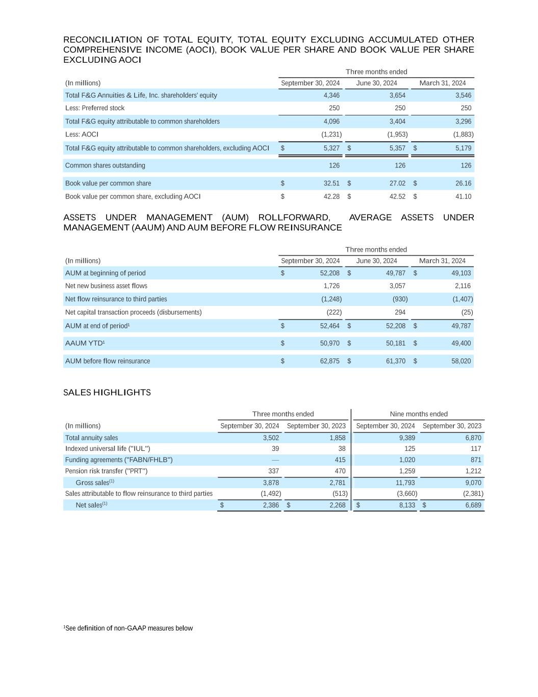 RECONCILIATION OF TOTAL EQUITY, TOTAL EQUITY EXCLUDING ACCUMULATED OTHER COMPREHENSIVE INCOME (AOCI), BOOK VALUE PER SHARE AND BOOK VALUE PER SHARE EXCLUDING AOCI Three months ended (In millions) September 30, 2024 June 30, 2024 March 31, 2024 Total F&G Annuities & Life, Inc. shareholders' equity 4,346 3,654 3,546 Less: Preferred stock 250 250 250 Total F&G equity attributable to common shareholders 4,096 3,404 3,296 Less: AOCI (1,231) (1,953) (1,883) Total F&G equity attributable to common shareholders, excluding AOCI $ 5,327 $ 5,357 $ 5,179 Common shares outstanding 126 126 126 Book value per common share $ 32.51 $ 27.02 $ 26.16 Book value per common share, excluding AOCI $ 42.28 $ 42.52 $ 41.10 ASSETS UNDER MANAGEMENT (AUM) ROLLFORWARD, AVERAGE ASSETS UNDER MANAGEMENT (AAUM) AND AUM BEFORE FLOW REINSURANCE Three months ended (In millions) September 30, 2024 June 30, 2024 March 31, 2024 AUM at beginning of period $ 52,208 $ 49,787 $ 49,103 Net new business asset flows 1,726 3,057 2,116 Net flow reinsurance to third parties (1,248) (930) (1,407) Net capital transaction proceeds (disbursements) (222) 294 (25) AUM at end of period¹ $ 52,464 $ 52,208 $ 49,787 AAUM YTD¹ $ 50,970 $ 50,181 $ 49,400 AUM before flow reinsurance $ 62,875 $ 61,370 $ 58,020 SALES HIGHLIGHTS Three months ended Nine months ended (In millions) September 30, 2024 September 30, 2023 September 30, 2024 September 30, 2023 Total annuity sales 3,502 1,858 9,389 6,870 Indexed universal life ("IUL") 39 38 125 117 Funding agreements ("FABN/FHLB") — 415 1,020 871 Pension risk transfer ("PRT") 337 470 1,259 1,212 Gross sales(1) 3,878 2,781 11,793 9,070 Sales attributable to flow reinsurance to third parties (1,492) (513) (3,660) (2,381) Net sales(1) $ 2,386 $ 2,268 $ 8,133 $ 6,689 1See definition of non-GAAP measures below