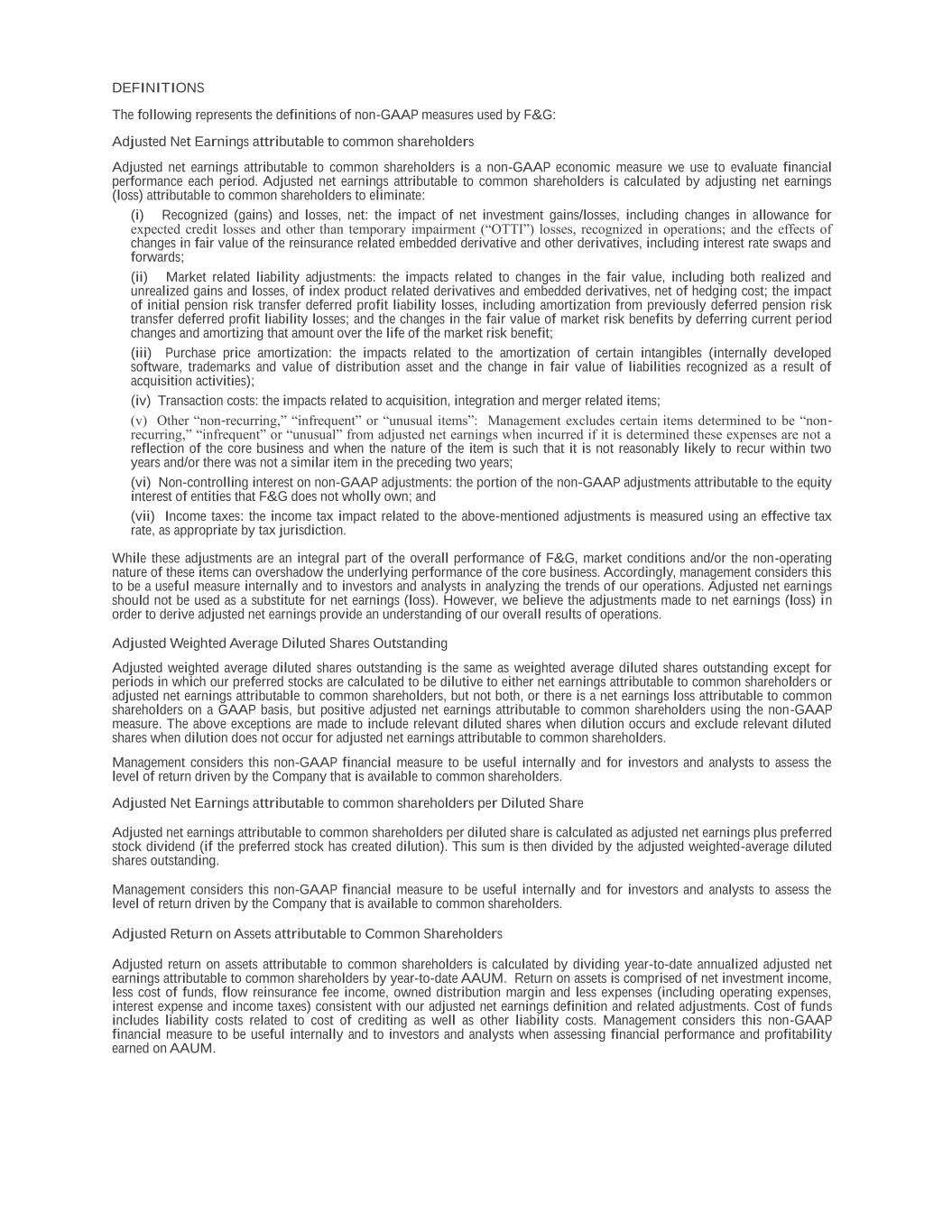 DEFINITIONS The following represents the definitions of non-GAAP measures used by F&G: Adjusted Net Earnings attributable to common shareholders Adjusted net earnings attributable to common shareholders is a non-GAAP economic measure we use to evaluate financial performance each period. Adjusted net earnings attributable to common shareholders is calculated by adjusting net earnings (loss) attributable to common shareholders to eliminate: (i) Recognized (gains) and losses, net: the impact of net investment gains/losses, including changes in allowance for expected credit losses and other than temporary impairment (“OTTI”) losses, recognized in operations; and the effects of changes in fair value of the reinsurance related embedded derivative and other derivatives, including interest rate swaps and forwards; (ii) Market related liability adjustments: the impacts related to changes in the fair value, including both realized and unrealized gains and losses, of index product related derivatives and embedded derivatives, net of hedging cost; the impact of initial pension risk transfer deferred profit liability losses, including amortization from previously deferred pension risk transfer deferred profit liability losses; and the changes in the fair value of market risk benefits by deferring current period changes and amortizing that amount over the life of the market risk benefit; (iii) Purchase price amortization: the impacts related to the amortization of certain intangibles (internally developed software, trademarks and value of distribution asset and the change in fair value of liabilities recognized as a result of acquisition activities); (iv) Transaction costs: the impacts related to acquisition, integration and merger related items; (v) Other “non-recurring,” “infrequent” or “unusual items”: Management excludes certain items determined to be “non- recurring,” “infrequent” or “unusual” from adjusted net earnings when incurred if it is determined these expenses are not a reflection of the core business and when the nature of the item is such that it is not reasonably likely to recur within two years and/or there was not a similar item in the preceding two years; (vi) Non-controlling interest on non-GAAP adjustments: the portion of the non-GAAP adjustments attributable to the equity interest of entities that F&G does not wholly own; and (vii) Income taxes: the income tax impact related to the above-mentioned adjustments is measured using an effective tax rate, as appropriate by tax jurisdiction. While these adjustments are an integral part of the overall performance of F&G, market conditions and/or the non-operating nature of these items can overshadow the underlying performance of the core business. Accordingly, management considers this to be a useful measure internally and to investors and analysts in analyzing the trends of our operations. Adjusted net earnings should not be used as a substitute for net earnings (loss). However, we believe the adjustments made to net earnings (loss) in order to derive adjusted net earnings provide an understanding of our overall results of operations. Adjusted Weighted Average Diluted Shares Outstanding Adjusted weighted average diluted shares outstanding is the same as weighted average diluted shares outstanding except for periods in which our preferred stocks are calculated to be dilutive to either net earnings attributable to common shareholders or adjusted net earnings attributable to common shareholders, but not both, or there is a net earnings loss attributable to common shareholders on a GAAP basis, but positive adjusted net earnings attributable to common shareholders using the non-GAAP measure. The above exceptions are made to include relevant diluted shares when dilution occurs and exclude relevant diluted shares when dilution does not occur for adjusted net earnings attributable to common shareholders. Management considers this non-GAAP financial measure to be useful internally and for investors and analysts to assess the level of return driven by the Company that is available to common shareholders. Adjusted Net Earnings attributable to common shareholders per Diluted Share Adjusted net earnings attributable to common shareholders per diluted share is calculated as adjusted net earnings plus preferred stock dividend (if the preferred stock has created dilution). This sum is then divided by the adjusted weighted-average diluted shares outstanding. Management considers this non-GAAP financial measure to be useful internally and for investors and analysts to assess the level of return driven by the Company that is available to common shareholders. Adjusted Return on Assets attributable to Common Shareholders Adjusted return on assets attributable to common shareholders is calculated by dividing year-to-date annualized adjusted net earnings attributable to common shareholders by year-to-date AAUM. Return on assets is comprised of net investment income, less cost of funds, flow reinsurance fee income, owned distribution margin and less expenses (including operating expenses, interest expense and income taxes) consistent with our adjusted net earnings definition and related adjustments. Cost of funds includes liability costs related to cost of crediting as well as other liability costs. Management considers this non-GAAP financial measure to be useful internally and to investors and analysts when assessing financial performance and profitability earned on AAUM.