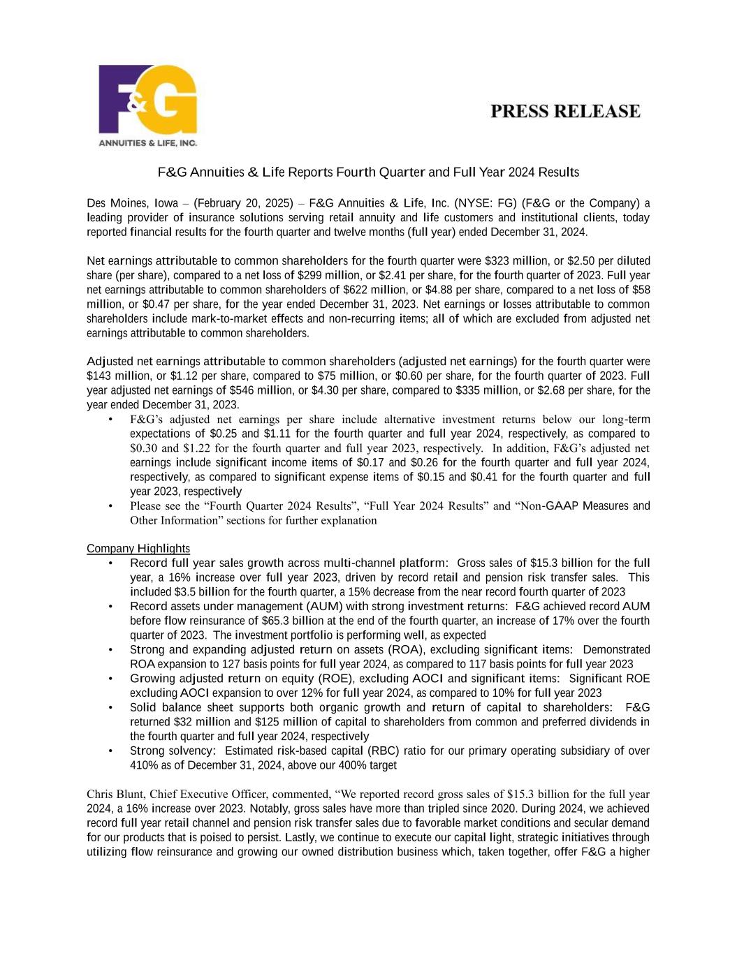 F&G Annuities & Life Reports Fourth Quarter and Full Year 2024 Results Des Moines, Iowa – (February 20, 2025) – F&G Annuities & Life, Inc. (NYSE: FG) (F&G or the Company) a leading provider of insurance solutions serving retail annuity and life customers and institutional clients, today reported financial results for the fourth quarter and twelve months (full year) ended December 31, 2024. Net earnings attributable to common shareholders for the fourth quarter were $323 million, or $2.50 per diluted share (per share), compared to a net loss of $299 million, or $2.41 per share, for the fourth quarter of 2023. Full year net earnings attributable to common shareholders of $622 million, or $4.88 per share, compared to a net loss of $58 million, or $0.47 per share, for the year ended December 31, 2023. Net earnings or losses attributable to common shareholders include mark-to-market effects and non-recurring items; all of which are excluded from adjusted net earnings attributable to common shareholders. Adjusted net earnings attributable to common shareholders (adjusted net earnings) for the fourth quarter were $143 million, or $1.12 per share, compared to $75 million, or $0.60 per share, for the fourth quarter of 2023. Full year adjusted net earnings of $546 million, or $4.30 per share, compared to $335 million, or $2.68 per share, for the year ended December 31, 2023. • F&G’s adjusted net earnings per share include alternative investment returns below our long-term expectations of $0.25 and $1.11 for the fourth quarter and full year 2024, respectively, as compared to $0.30 and $1.22 for the fourth quarter and full year 2023, respectively. In addition, F&G’s adjusted net earnings include significant income items of $0.17 and $0.26 for the fourth quarter and full year 2024, respectively, as compared to significant expense items of $0.15 and $0.41 for the fourth quarter and full year 2023, respectively • Please see the “Fourth Quarter 2024 Results”, “Full Year 2024 Results” and “Non-GAAP Measures and Other Information” sections for further explanation Company Highlights • Record full year sales growth across multi-channel platform: Gross sales of $15.3 billion for the full year, a 16% increase over full year 2023, driven by record retail and pension risk transfer sales. This included $3.5 billion for the fourth quarter, a 15% decrease from the near record fourth quarter of 2023 • Record assets under management (AUM) with strong investment returns: F&G achieved record AUM before flow reinsurance of $65.3 billion at the end of the fourth quarter, an increase of 17% over the fourth quarter of 2023. The investment portfolio is performing well, as expected • Strong and expanding adjusted return on assets (ROA), excluding significant items: Demonstrated ROA expansion to 127 basis points for full year 2024, as compared to 117 basis points for full year 2023 • Growing adjusted return on equity (ROE), excluding AOCI and significant items: Significant ROE excluding AOCI expansion to over 12% for full year 2024, as compared to 10% for full year 2023 • Solid balance sheet supports both organic growth and return of capital to shareholders: F&G returned $32 million and $125 million of capital to shareholders from common and preferred dividends in the fourth quarter and full year 2024, respectively • Strong solvency: Estimated risk-based capital (RBC) ratio for our primary operating subsidiary of over 410% as of December 31, 2024, above our 400% target Chris Blunt, Chief Executive Officer, commented, “We reported record gross sales of $15.3 billion for the full year 2024, a 16% increase over 2023. Notably, gross sales have more than tripled since 2020. During 2024, we achieved record full year retail channel and pension risk transfer sales due to favorable market conditions and secular demand for our products that is poised to persist. Lastly, we continue to execute our capital light, strategic initiatives through utilizing flow reinsurance and growing our owned distribution business which, taken together, offer F&G a higher