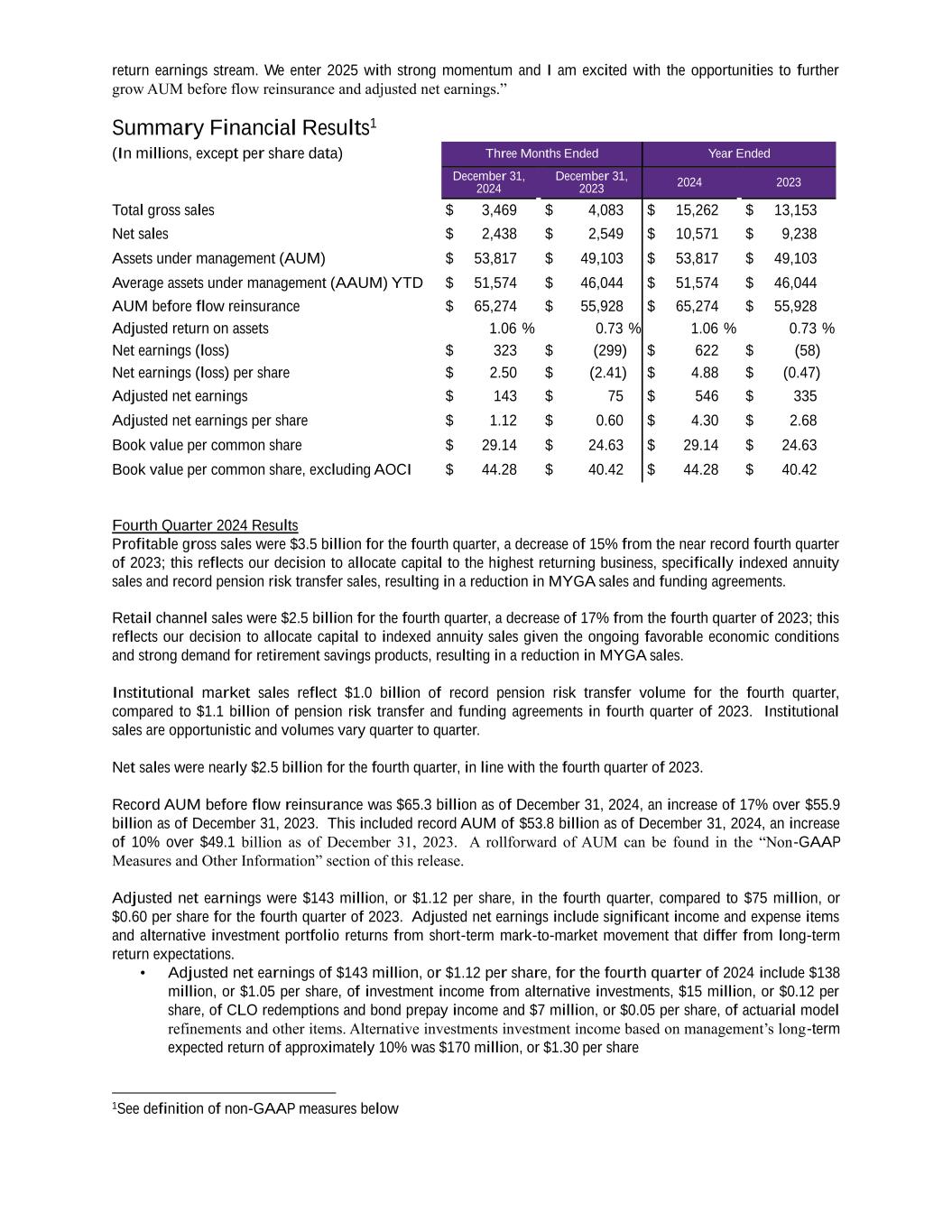 return earnings stream. We enter 2025 with strong momentum and I am excited with the opportunities to further grow AUM before flow reinsurance and adjusted net earnings.” Summary Financial Results1 (In millions, except per share data) Three Months Ended Year Ended December 31, 2024 December 31, 2023 2024 2023 Total gross sales $ 3,469 $ 4,083 $ 15,262 $ 13,153 Net sales $ 2,438 $ 2,549 $ 10,571 $ 9,238 Assets under management (AUM) $ 53,817 $ 49,103 $ 53,817 $ 49,103 Average assets under management (AAUM) YTD $ 51,574 $ 46,044 $ 51,574 $ 46,044 AUM before flow reinsurance $ 65,274 $ 55,928 $ 65,274 $ 55,928 Adjusted return on assets 1.06 % 0.73 % 1.06 % 0.73 % Net earnings (loss) $ 323 $ (299) $ 622 $ (58) Net earnings (loss) per share $ 2.50 $ (2.41) $ 4.88 $ (0.47) Adjusted net earnings $ 143 $ 75 $ 546 $ 335 Adjusted net earnings per share $ 1.12 $ 0.60 $ 4.30 $ 2.68 Book value per common share $ 29.14 $ 24.63 $ 29.14 $ 24.63 Book value per common share, excluding AOCI $ 44.28 $ 40.42 $ 44.28 $ 40.42 Fourth Quarter 2024 Results Profitable gross sales were $3.5 billion for the fourth quarter, a decrease of 15% from the near record fourth quarter of 2023; this reflects our decision to allocate capital to the highest returning business, specifically indexed annuity sales and record pension risk transfer sales, resulting in a reduction in MYGA sales and funding agreements. Retail channel sales were $2.5 billion for the fourth quarter, a decrease of 17% from the fourth quarter of 2023; this reflects our decision to allocate capital to indexed annuity sales given the ongoing favorable economic conditions and strong demand for retirement savings products, resulting in a reduction in MYGA sales. Institutional market sales reflect $1.0 billion of record pension risk transfer volume for the fourth quarter, compared to $1.1 billion of pension risk transfer and funding agreements in fourth quarter of 2023. Institutional sales are opportunistic and volumes vary quarter to quarter. Net sales were nearly $2.5 billion for the fourth quarter, in line with the fourth quarter of 2023. Record AUM before flow reinsurance was $65.3 billion as of December 31, 2024, an increase of 17% over $55.9 billion as of December 31, 2023. This included record AUM of $53.8 billion as of December 31, 2024, an increase of 10% over $49.1 billion as of December 31, 2023. A rollforward of AUM can be found in the “Non-GAAP Measures and Other Information” section of this release. Adjusted net earnings were $143 million, or $1.12 per share, in the fourth quarter, compared to $75 million, or $0.60 per share for the fourth quarter of 2023. Adjusted net earnings include significant income and expense items and alternative investment portfolio returns from short-term mark-to-market movement that differ from long-term return expectations. • Adjusted net earnings of $143 million, or $1.12 per share, for the fourth quarter of 2024 include $138 million, or $1.05 per share, of investment income from alternative investments, $15 million, or $0.12 per share, of CLO redemptions and bond prepay income and $7 million, or $0.05 per share, of actuarial model refinements and other items. Alternative investments investment income based on management’s long-term expected return of approximately 10% was $170 million, or $1.30 per share 1See definition of non-GAAP measures below