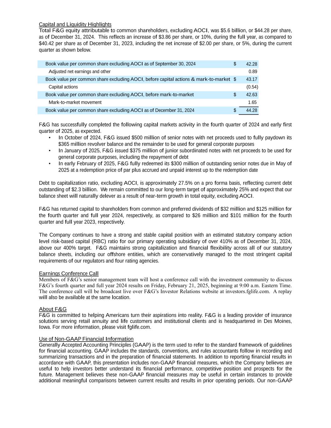 Capital and Liquidity Highlights Total F&G equity attributable to common shareholders, excluding AOCI, was $5.6 billion, or $44.28 per share, as of December 31, 2024. This reflects an increase of $3.86 per share, or 10%, during the full year, as compared to $40.42 per share as of December 31, 2023, including the net increase of $2.00 per share, or 5%, during the current quarter as shown below. Book value per common share excluding AOCI as of September 30, 2024 $ 42.28 Adjusted net earnings and other 0.89 Book value per common share excluding AOCI, before capital actions & mark-to-market $ 43.17 Capital actions (0.54) Book value per common share excluding AOCI, before mark-to-market $ 42.63 Mark-to-market movement 1.65 Book value per common share excluding AOCI as of December 31, 2024 $ 44.28 F&G has successfully completed the following capital markets activity in the fourth quarter of 2024 and early first quarter of 2025, as expected. • In October of 2024, F&G issued $500 million of senior notes with net proceeds used to fully paydown its $365 million revolver balance and the remainder to be used for general corporate purposes • In January of 2025, F&G issued $375 million of junior subordinated notes with net proceeds to be used for general corporate purposes, including the repayment of debt • In early February of 2025, F&G fully redeemed its $300 million of outstanding senior notes due in May of 2025 at a redemption price of par plus accrued and unpaid interest up to the redemption date Debt to capitalization ratio, excluding AOCI, is approximately 27.5% on a pro forma basis, reflecting current debt outstanding of $2.3 billion. We remain committed to our long-term target of approximately 25% and expect that our balance sheet will naturally delever as a result of near-term growth in total equity, excluding AOCI. F&G has returned capital to shareholders from common and preferred dividends of $32 million and $125 million for the fourth quarter and full year 2024, respectively, as compared to $26 million and $101 million for the fourth quarter and full year 2023, respectively. The Company continues to have a strong and stable capital position with an estimated statutory company action level risk-based capital (RBC) ratio for our primary operating subsidiary of over 410% as of December 31, 2024, above our 400% target. F&G maintains strong capitalization and financial flexibility across all of our statutory balance sheets, including our offshore entities, which are conservatively managed to the most stringent capital requirements of our regulators and four rating agencies. Earnings Conference Call Members of F&G’s senior management team will host a conference call with the investment community to discuss F&G’s fourth quarter and full year 2024 results on Friday, February 21, 2025, beginning at 9:00 a.m. Eastern Time. The conference call will be broadcast live over F&G’s Investor Relations website at investors.fglife.com. A replay will also be available at the same location. About F&G F&G is committed to helping Americans turn their aspirations into reality. F&G is a leading provider of insurance solutions serving retail annuity and life customers and institutional clients and is headquartered in Des Moines, Iowa. For more information, please visit fglife.com. Use of Non-GAAP Financial Information Generally Accepted Accounting Principles (GAAP) is the term used to refer to the standard framework of guidelines for financial accounting. GAAP includes the standards, conventions, and rules accountants follow in recording and summarizing transactions and in the preparation of financial statements. In addition to reporting financial results in accordance with GAAP, this presentation includes non-GAAP financial measures, which the Company believes are useful to help investors better understand its financial performance, competitive position and prospects for the future. Management believes these non-GAAP financial measures may be useful in certain instances to provide additional meaningful comparisons between current results and results in prior operating periods. Our non-GAAP