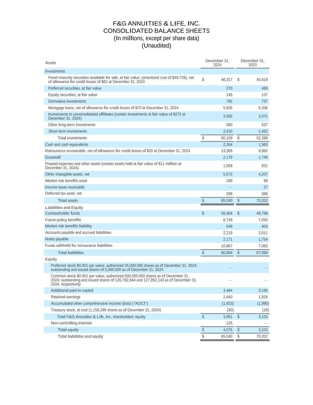 F&G ANNUITIES & LIFE, INC. CONSOLIDATED BALANCE SHEETS (In millions, except per share data) (Unaudited) Assets December 31, 2024 December 31, 2023 Investments Fixed maturity securities available for sale, at fair value, (amortized cost of $49,729), net of allowance for credit losses of $62 at December 31, 2024 $ 46,317 $ 40,419 Preferred securities, at fair value 270 469 Equity securities, at fair value 145 137 Derivative investments 792 797 Mortgage loans, net of allowance for credit losses of $70 at December 31, 2024 5,926 5,336 Investments in unconsolidated affiliates (certain investments at fair value of $272 at December 31, 2024) 3,565 3,071 Other long-term investments 580 537 Short-term investments 2,410 1,452 Total investments $ 60,109 $ 52,289 Cash and cash equivalents 2,264 1,563 Reinsurance recoverable, net of allowance for credit losses of $20 at December 31, 2024 13,369 8,960 Goodwill 2,179 1,749 Prepaid expenses and other assets (certain assets held at fair value of $11 million at December 31, 2024) 1,059 931 Other intangible assets, net 5,572 4,207 Market risk benefits asset 189 88 Income taxes receivable — 27 Deferred tax asset, net 299 388 Total assets $ 85,040 $ 70,202 Liabilities and Equity Contractholder funds $ 56,404 $ 48,798 Future policy benefits 8,749 7,050 Market risk benefits liability 549 403 Accounts payable and accrued liabilities 2,219 2,011 Notes payable 2,171 1,754 Funds withheld for reinsurance liabilities 10,867 7,083 Total liabilities $ 80,964 $ 67,099 Equity Preferred stock $0.001 par value; authorized 25,000,000 shares as of December 31, 2024; outstanding and issued shares of 5,000,000 as of December 31, 2024 — — Common stock $0.001 par value; authorized 500,000,000 shares as of December 31, 2024; outstanding and issued shares of 126,792,844 and 127,952,143 as of December 31, 2024, respectively — — Additional paid-in-capital 3,464 3,185 Retained earnings 2,440 1,926 Accumulated other comprehensive income (loss) ("AOCI") (1,923) (1,990) Treasury stock, at cost (1,159,299 shares as of December 31, 2024) (30) (18) Total F&G Annuities & Life, Inc. shareholders' equity $ 3,951 $ 3,103 Non-controlling interests 125 — Total equity $ 4,076 $ 3,103 Total liabilities and equity $ 85,040 $ 70,202