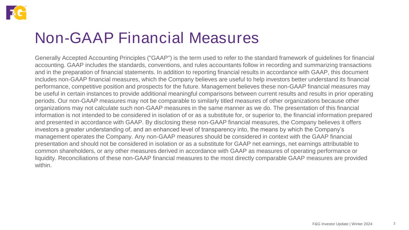 Non-GAAP Financial Measures 3F&G Investor Update | Winter 2024 Generally Accepted Accounting Principles ("GAAP") is the term used to refer to the standard framework of guidelines for financial accounting. GAAP includes the standards, conventions, and rules accountants follow in recording and summarizing transactions and in the preparation of financial statements. In addition to reporting financial results in accordance with GAAP, this document includes non-GAAP financial measures, which the Company believes are useful to help investors better understand its financial performance, competitive position and prospects for the future. Management believes these non-GAAP financial measures may be useful in certain instances to provide additional meaningful comparisons between current results and results in prior operating periods. Our non-GAAP measures may not be comparable to similarly titled measures of other organizations because other organizations may not calculate such non-GAAP measures in the same manner as we do. The presentation of this financial information is not intended to be considered in isolation of or as a substitute for, or superior to, the financial information prepared and presented in accordance with GAAP. By disclosing these non-GAAP financial measures, the Company believes it offers investors a greater understanding of, and an enhanced level of transparency into, the means by which the Company’s management operates the Company. Any non-GAAP measures should be considered in context with the GAAP financial presentation and should not be considered in isolation or as a substitute for GAAP net earnings, net earnings attributable to common shareholders, or any other measures derived in accordance with GAAP as measures of operating performance or liquidity. Reconciliations of these non-GAAP financial measures to the most directly comparable GAAP measures are provided within.