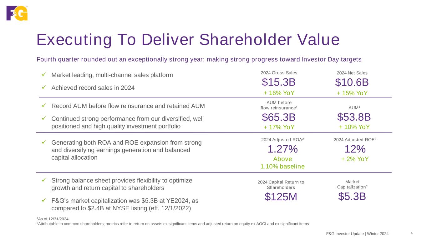 Disclaimer & Forward-Looking Statements 2F&G Investor Update | Winter 2024 This presentation contains forward-looking statements that are subject to known and unknown risks and uncertainties, many of which are beyond our control. Some of the forward-looking statements can be identified by the use of terms such as “believes”, “expects”, “may”, “will”, “could”, “seeks”, “intends”, “plans”, “estimates”, “anticipates” or other comparable terms. Statements that are not historical facts, including statements regarding our expectations, hopes, intentions or strategies regarding the future are forward-looking statements. Forward-looking statements are based on management's beliefs, as well as assumptions made by, and information currently available to, management. Because such statements are based on expectations as to future financial and operating results and are not statements of fact, actual results may differ materially from those projected. We undertake no obligation to update any forward-looking statements, whether as a result of new information, future events or otherwise. The risks and uncertainties which forward-looking statements are subject to include, but are not limited to: general economic conditions and other factors, including prevailing interest and unemployment rate levels and stock and credit market performance; natural disasters, public health crises, international tensions and conflicts, geopolitical events, terrorist acts, labor strikes, political crisis, accidents and other events; concentration in certain states for distribution of our products; the impact of interest rate fluctuations; equity market volatility or disruption; the impact of credit risk of our counterparties; changes in our assumptions and estimates regarding amortization of our deferred acquisition costs, deferred sales inducements and value of business acquired balances; regulatory changes or actions, including those relating to regulation of financial services affecting (among other things) underwriting of insurance products and regulation of the sale, underwriting and pricing of products and minimum capitalization and statutory reserve requirements for insurance companies, or the ability of our insurance subsidiaries to make cash distributions to us; and other factors discussed in “Risk Factors” and other sections of the Company’s Form 10-K and other filings with the Securities and Exchange Commission.