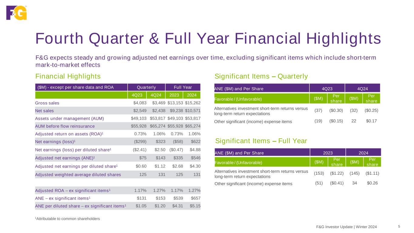 ✓ Market leading, multi-channel sales platform ✓ Achieved record sales in 2024 ✓ Record AUM before flow reinsurance and retained AUM ✓ Continued strong performance from our diversified, well positioned and high quality investment portfolio ✓ Generating both ROA and ROE expansion from strong and diversifying earnings generation and balanced capital allocation ✓ Strong balance sheet provides flexibility to optimize growth and return capital to shareholders ✓ F&G’s market capitalization was $5.3B at YE2024, as compared to $2.4B at NYSE listing (eff. 12/1/2022) Fourth quarter rounded out an exceptionally strong year; making strong progress toward Investor Day targets 2024 Adjusted ROA2 1.27% Above 1.10% baseline Executing To Deliver Shareholder Value 4F&G Investor Update | Winter 2024 1As of 12/31/2024 2Attributable to common shareholders; metrics refer to return on assets ex significant items and adjusted return on equity ex AOCI and ex significant items 2024 Gross Sales $15.3B + 16% YoY 2024 Net Sales $10.6B + 15% YoY AUM1 $53.8B + 10% YoY AUM before flow reinsurance1 $65.3B + 17% YoY 2024 Capital Return to Shareholders $125M Market Capitalization1 $5.3B 2024 Adjusted ROE2 12% + 2% YoY