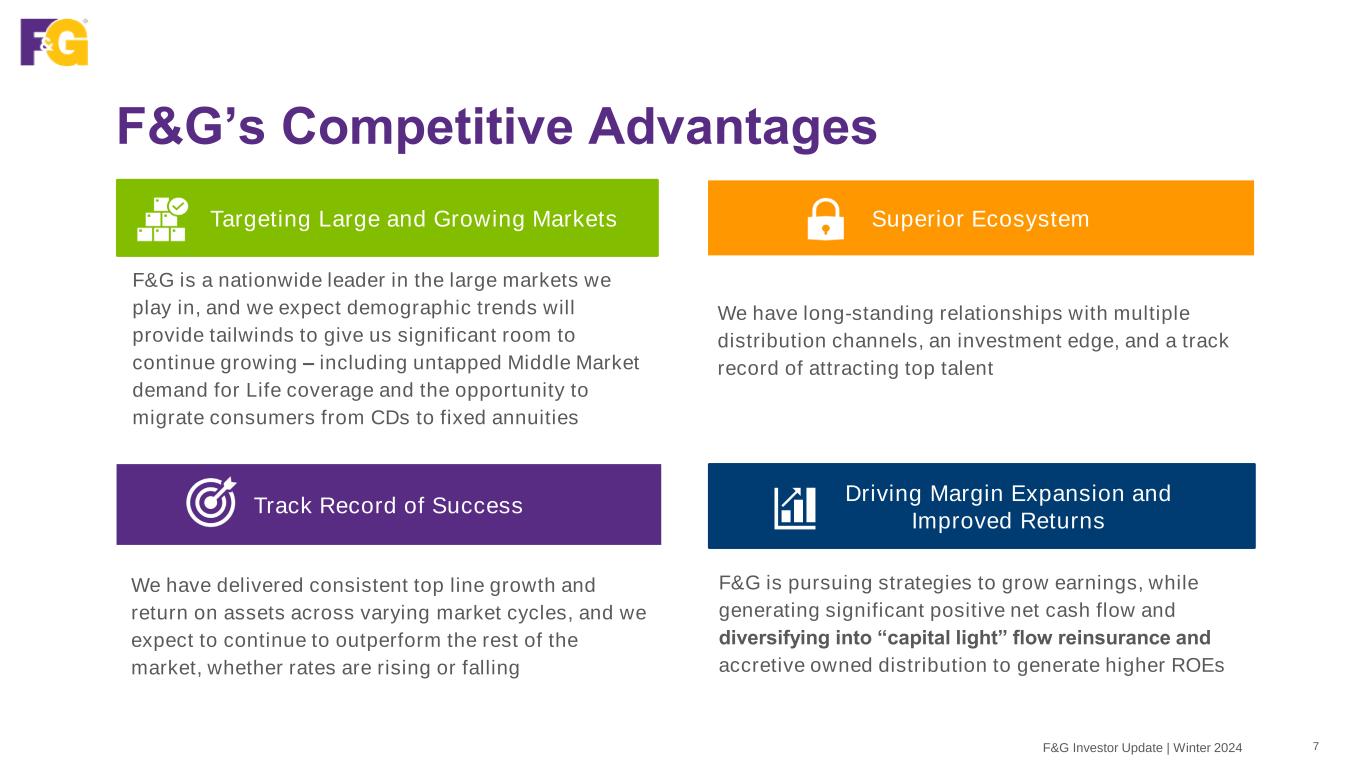 About F&G Snapshot 6F&G Investor Update | Winter 2024 Retail Annuities • Fixed indexed annuity (FIA) • Registered index-linked annuities (RILA) • Multi-year guaranteed annuity (MYGA) Pension Risk Transfer (PRT) Life Insurance • Indexed universal life (IUL) Funding Agreements • Funding agreement backed notes (FABN) • Federal Home Loan Bank (FHLB) • Founded in 1959 as a life insurance company • Listed on the New York Stock Exchange (NYSE: FG) eff. 12/1/2022 • Fidelity National Financial (NYSE: FNF) retains ~85% ownership • Headquartered in Des Moines, IA; 1,300+ employees • Ranking as a Top Workplaces company for 7 consecutive years Retail Channels • Independent insurance agents (IMOs) • Broker Dealers • Banks Institutional Markets • Pension risk transfer • Funding agreements Our Product Lines Five Distinct Distribution Channels / Markets Background Financial Strength Ratings A Stable A.M. Best A- Stable S&P Global A- Stable Fitch Ratings A3 Stable Moody’s