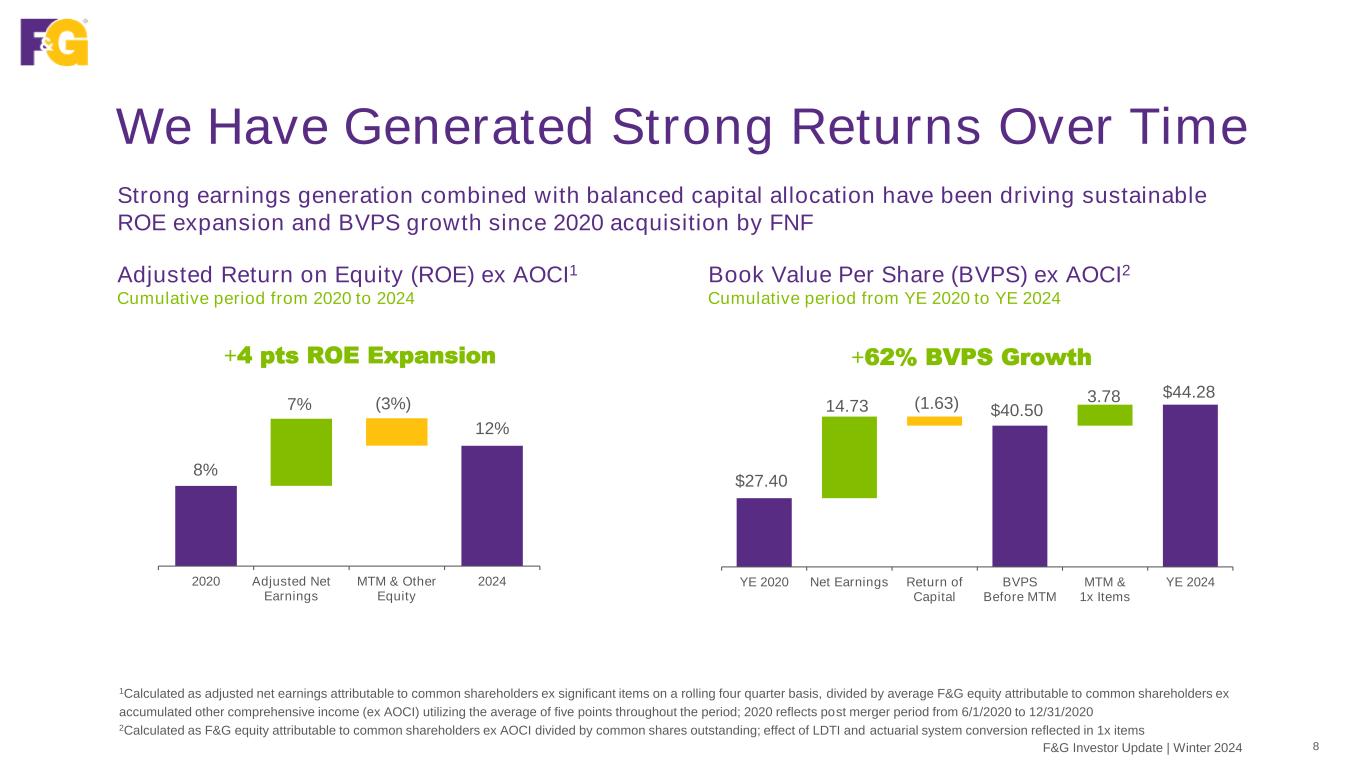 F&G’s Competitive Advantages 7F&G Investor Update | Winter 2024 v Track Record of Success We have delivered consistent top line growth and return on assets across varying market cycles, and we expect to continue to outperform the rest of the market, whether rates are rising or falling v Targeting Large and Growing Markets We have long-standing relationships with multiple distribution channels, an investment edge, and a track record of attracting top talent Superior Ecosystem F&G is a nationwide leader in the large markets we play in, and we expect demographic trends will provide tailwinds to give us significant room to continue growing – including untapped Middle Market demand for Life coverage and the opportunity to migrate consumers from CDs to fixed annuities Driving Margin Expansion and Improved Returns F&G is pursuing strategies to grow earnings, while generating significant positive net cash flow and diversifying into “capital light” flow reinsurance and accretive owned distribution to generate higher ROEs