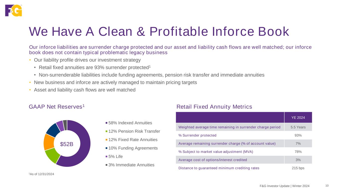 We Are Driving Toward Our Investor Day Targets • Spread-based earnings • Driven by asset growth • Margin expansion through investment margin & scale benefit Retained Sales • Fee-based earnings • Lower marginal cost of capital • Enhances cash flow • Accretive to return on equity Flow Reinsurance • Fee-based earnings • Lower marginal cost of capital • Accretive to return on equity • Solidifies relationships with key partners Owned Distribution We remain focused delivering margin expansion through our retained business, as well as diversifying sources of earnings through accretive flow reinsurance and owned distribution Grow AUM by 50% Expand adjusted ROA ex significant items to 1.33% to 1.55% Increase adjusted ROE ex AOCI and significant items to 13 to 14% Expand our P/E multiple to 7-8x We continue to make good progress toward the medium term financial targets laid out at our 2023 Investor Day: F&G Investor Update | Winter 2024 9
