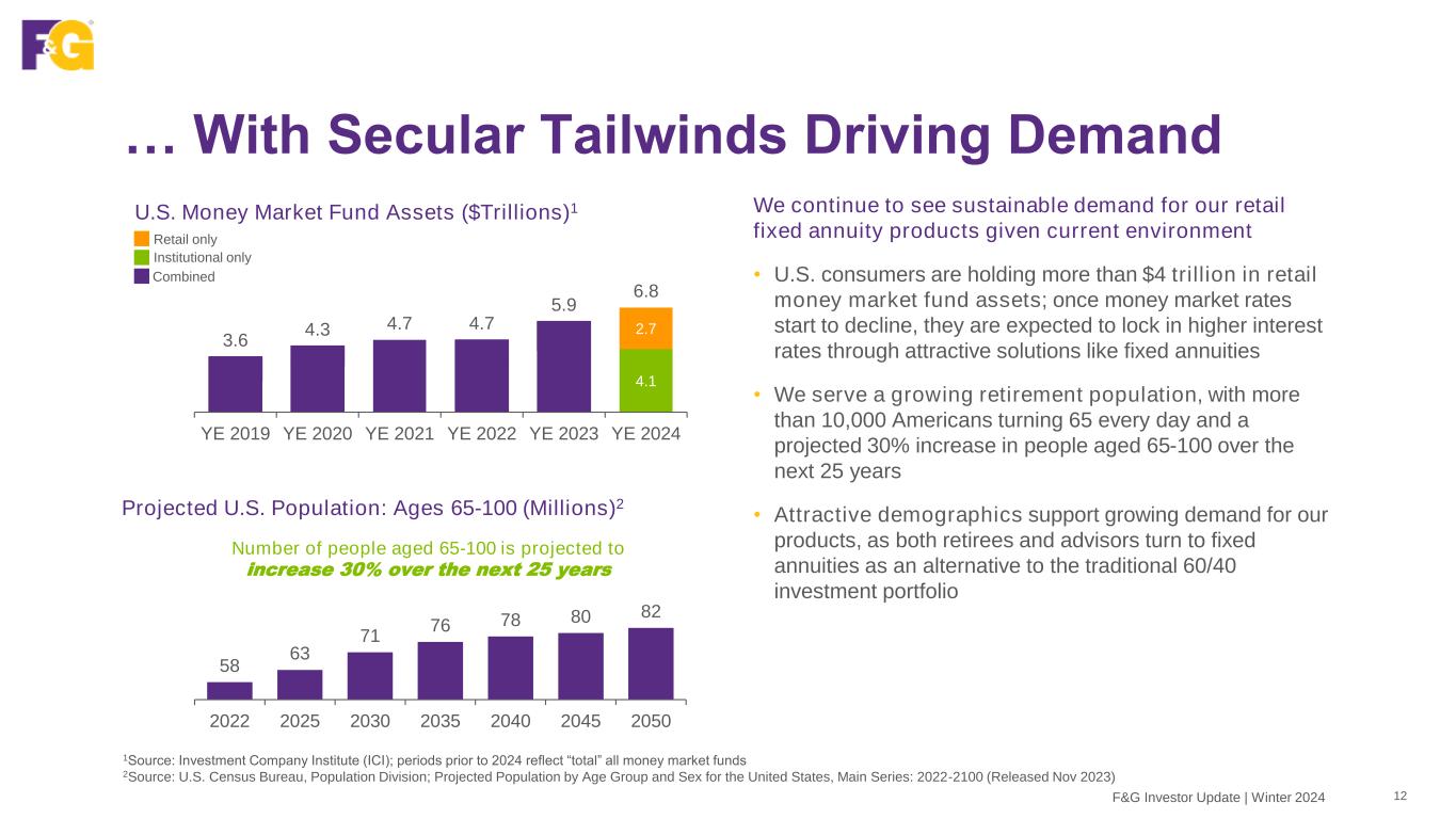 We Are Playing In High Growth Markets 11F&G Investor Update | Winter 2024 The U.S. retirement and middle markets are growing and we are both well established and well positioned for continued growth in our retail channels and institutional markets 13Q24 Quarterly Retirement Market Data, Investment Company Institute. 2Personal savings in the U.S. per Federal Reserve Bank of St. Louis as of 11/1/24. 3U.S. Pension Risk Transfer Sales soar 36% in the third quarter 2024, Source LIMRA, 12/10/24. 4Legal & General Pension Risk Transfer Monitor, September 2024 Market Update. 53Q24 U.S. retail life sales (annualized premium) and U.S. individual annuity sales per LIMRA. 6Board of Governors of the Federal Reserve System, Funding Agreement-Backed Securities (FABS) as of 9/30/24 Registered index linked annuities (RILAs) provide alternative with upside potential and limited downside risk Consumers increasingly rely on personal savings for retirement income Untapped demand for permanent life insurance, especially in the Middle Market Transaction volume likely to continue4 Mutual Fund 401(k) Assets1 U.S. Consumer Savings2 Pension Risk Transfer3 Retail Life & Annuities5 Funding Agreements6 $5.4T $968B $341B $298B $210B