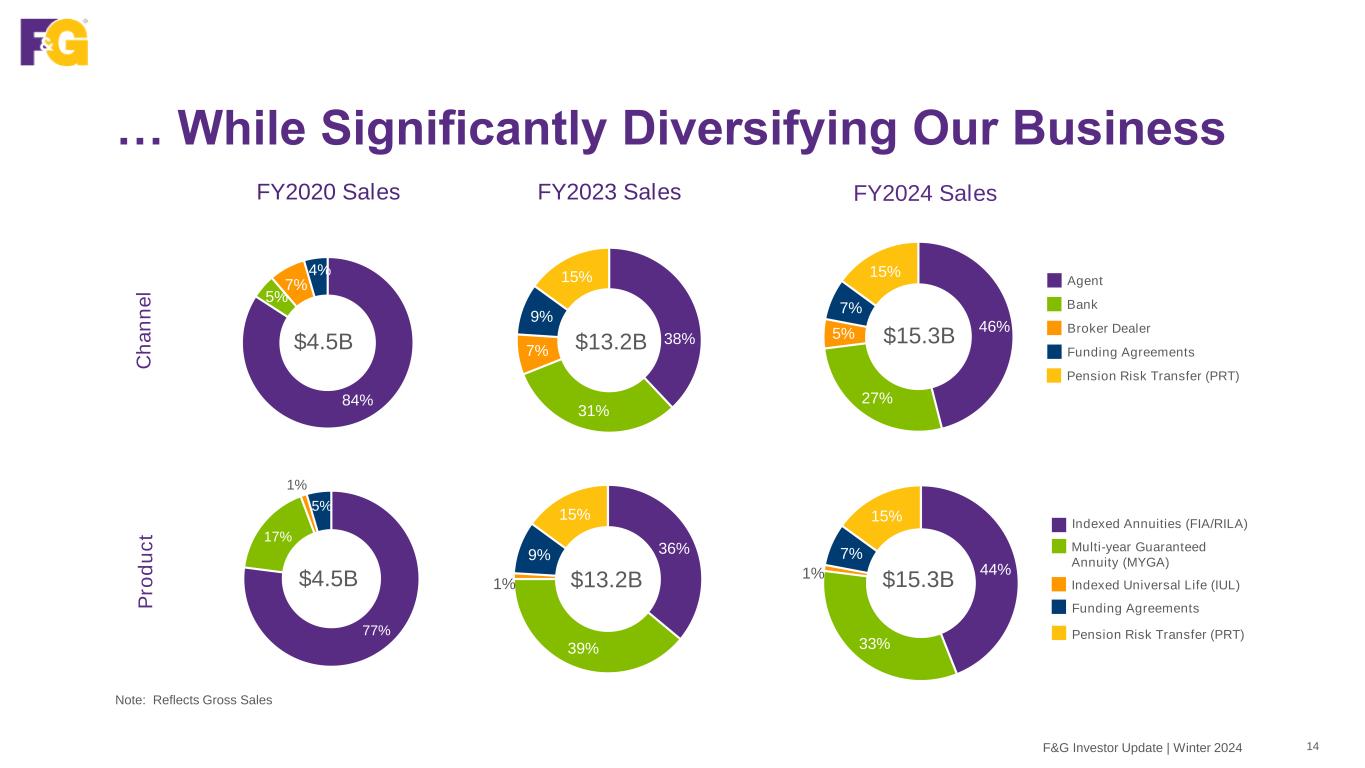… And We’re Winning … 13F&G Investor Update | Winter 2024 1CAGR reflects 2019-2024 annual periods Annual Gross Sales by Retail Channel and Institutional Market ($B) 2019 2020 2021 2022 2023 2024 Funding Agreements Agent PRT Broker Dealer Bank $11.3B $9.6B $4.5B $3.9B FNF and F&G Merger (June 2020) $13.2B +31% CAGR1 $15.3B