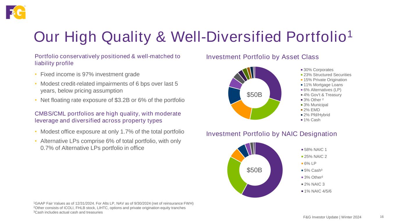 Our Owned Distribution Track Record 15F&G Investor Update | Winter 2024 Our owned distribution strategy is contributing to margin expansion and is a capital light, diversified source of fee-based earnings Portfolio is performing as expected • FY2024 EBITDA (cash): ~$65M • Owned distribution margin driven by seasonality, timing of dividends, mix of business & affiliated vs. unaffiliated sales • Owned distribution margin of $46M FY2024 (ANE) • Adjusted ROA contribution of 9 bps (ANE) • GAAP reporting items to note: • Owned distribution margin reflects dividend income from minority-owned interests, plus percent share of margin for majority-owned interests • Affiliated revenue from F&G products sold by owned distribution is reflected in our product margin1, not the owned distribution margin Life Network Marketing IMO Traditional Annuity IMO “B2B” Annuity IMO Life Brokerage IMO ~$680M Cumulative deals closed 1Amount of affiliated revenue from F&G products sold by owned distribution and reflected in product margin (not the owned distribution margin): $10M in 4Q24 and $22M in FY2024