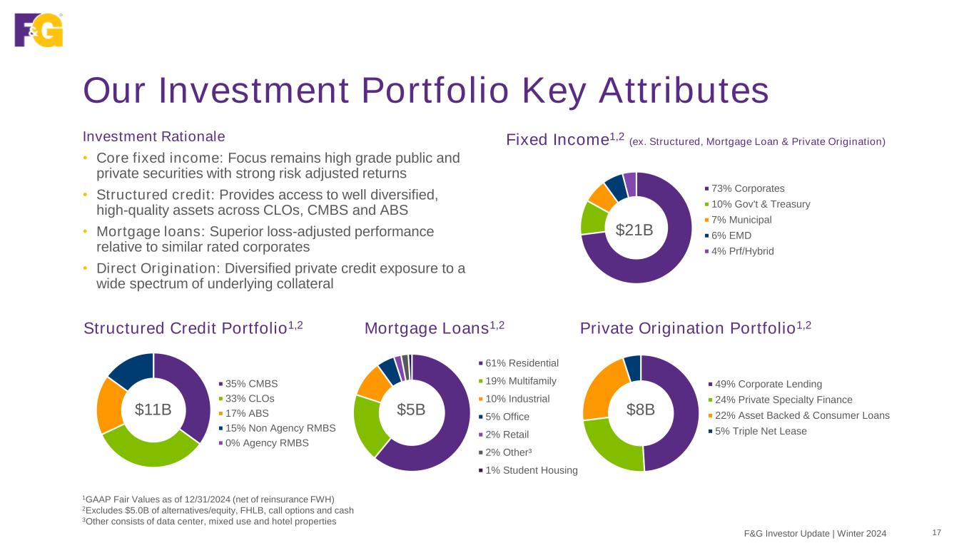 58% NAIC 1 25% NAIC 2 6% LP 5% Cash³ 3% Other² 2% NAIC 3 1% NAIC 4/5/6 30% Corporates 23% Structured Securities 15% Private Origination 11% Mortgage Loans 6% Alternatives (LP) 4% Gov't & Treasury 3% Other ² 3% Municipal 2% EMD 2% Pfd/Hybrid 1% Cash Our High Quality & Well-Diversified Portfolio1 16F&G Investor Update | Winter 2024 1GAAP Fair Values as of 12/31/2024. For Alts LP, NAV as of 9/30/2024 (net of reinsurance FWH) 2Other consists of ICOLI, FHLB stock, LIHTC, options and private origination equity tranches 3Cash includes actual cash and treasuries Investment Portfolio by Asset Class Investment Portfolio by NAIC Designation Portfolio conservatively positioned & well-matched to liability profile • Fixed income is 97% investment grade • Modest credit-related impairments of 6 bps over last 5 years, below pricing assumption • Net floating rate exposure of $3.2B or 6% of the portfolio CMBS/CML portfolios are high quality, with moderate leverage and diversified across property types • Modest office exposure at only 1.7% of the total portfolio • Alternative LPs comprise 6% of total portfolio, with only 0.7% of Alternative LPs portfolio in office $50B $50B