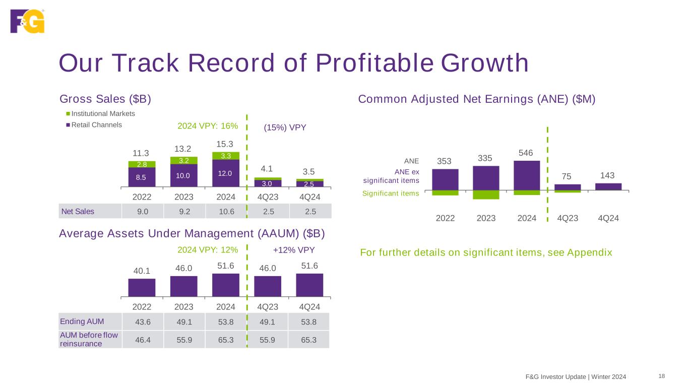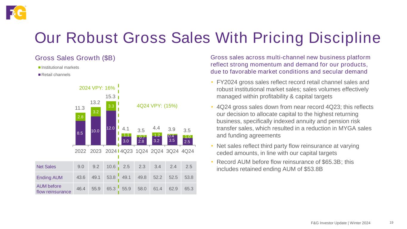Net Sales 9.0 9.2 10.6 2.5 2.5 8.5 10.0 12.0 3.0 2.5 2.8 3.2 3.3 11.3 13.2 15.3 4.1 3.5 2022 2023 2024 4Q23 4Q24 Institutional Markets Retail Channels 353 335 546 75 143 2022 2023 2024 4Q23 4Q24 Our Track Record of Profitable Growth Gross Sales ($B) Average Assets Under Management (AAUM) ($B) Common Adjusted Net Earnings (ANE) ($M) F&G Investor Update | Winter 2024 18 40.1 46.0 51.6 46.0 51.6 2022 2023 2024 4Q23 4Q24 +12% VPY2024 VPY: 12% Ending AUM 43.6 49.1 53.8 49.1 53.8 AUM before flow reinsurance 46.4 55.9 65.3 55.9 65.3 (15%) VPY2024 VPY: 16% ANE ANE ex significant items Significant items For further details on significant items, see Appendix