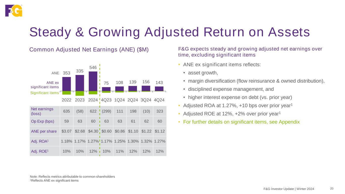 Our Robust Gross Sales With Pricing Discipline Gross Sales Growth ($B) 8.5 10.0 12.0 3.0 2.8 3.2 3.5 2.5 2.8 3.2 3.3 1.1 0.7 1.2 0.4 1.0 11.3 13.2 15.3 4.1 3.5 4.4 3.9 3.5 2022 2023 2024 4Q23 1Q24 2Q24 3Q24 4Q24 Institutional markets Retail channels F&G Investor Update | Winter 2024 2024 VPY: 16% 4Q24 VPY: (15%) 19 Gross sales across multi-channel new business platform reflect strong momentum and demand for our products, due to favorable market conditions and secular demand • FY2024 gross sales reflect record retail channel sales and robust institutional market sales; sales volumes effectively managed within profitability & capital targets • 4Q24 gross sales down from near record 4Q23; this reflects our decision to allocate capital to the highest returning business, specifically indexed annuity and pension risk transfer sales, which resulted in a reduction in MYGA sales and funding agreements • Net sales reflect third party flow reinsurance at varying ceded amounts, in line with our capital targets • Record AUM before flow reinsurance of $65.3B; this includes retained ending AUM of $53.8BNet Sales 9.0 9.2 10.6 2.5 2.3 3.4 2.4 2.5 Ending AUM 43.6 49.1 53.8 49.1 49.8 52.2 52.5 53.8 AUM before flow reinsurance 46.4 55.9 65.3 55.9 58.0 61.4 62.9 65.3
