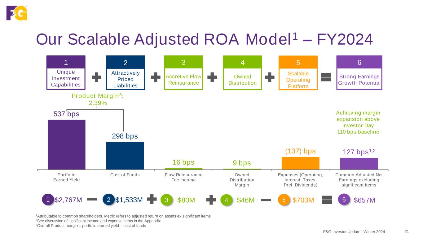 353 335 546 75 108 139 156 143 2022 2023 2024 4Q23 1Q24 2Q24 3Q24 4Q24 Net earnings (loss) 635 (58) 622 (299) 111 198 (10) 323 Op Exp (bps) 59 63 60 63 63 61 62 60 ANE per share $3.07 $2.68 $4.30 $0.60 $0.86 $1.10 $1.22 $1.12 Adj. ROA1 1.18% 1.17% 1.27% 1.17% 1.25% 1.30% 1.32% 1.27% Adj. ROE1 10% 10% 12% 10% 11% 12% 12% 12% Steady & Growing Adjusted Return on Assets 20F&G Investor Update | Winter 2024 Common Adjusted Net Earnings (ANE) ($M) Note: Reflects metrics attributable to common shareholders 1Reflects ANE ex significant items F&G expects steady and growing adjusted net earnings over time, excluding significant items • ANE ex significant items reflects: • asset growth, • margin diversification (flow reinsurance & owned distribution), • disciplined expense management, and • higher interest expense on debt (vs. prior year) • Adjusted ROA at 1.27%, +10 bps over prior year1 • Adjusted ROE at 12%, +2% over prior year1 • For further details on significant items, see Appendix ANE ANE ex significant items Significant items
