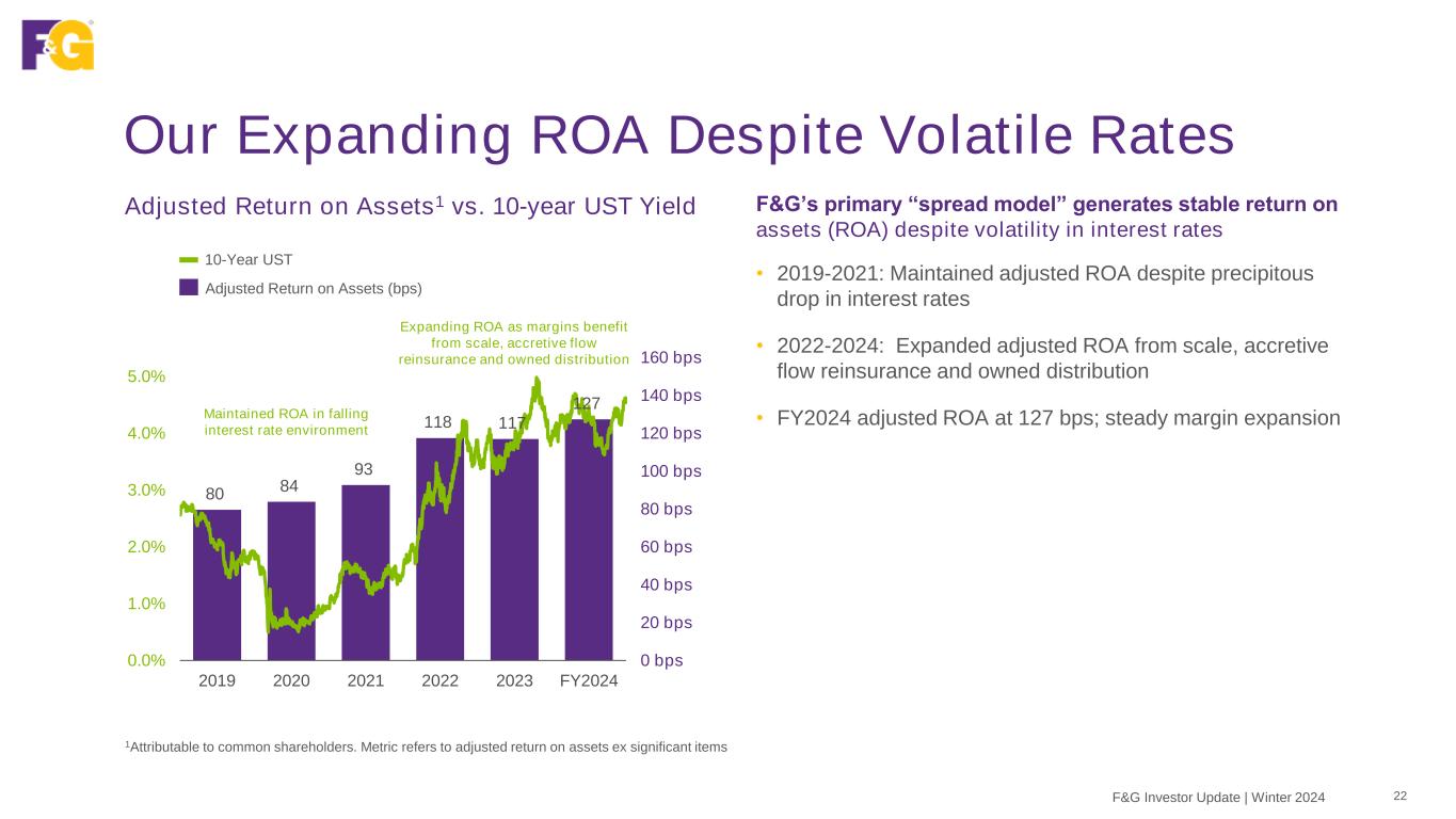 537 bps 298 bps 16 bps 9 bps (137) bps 127 bps1,2 Portfolio Earned Yield Cost of Funds Flow Reinsurance Fee Income Owned Distribution Margin Expenses (Operating, Interest, Taxes, Pref. Dividends) Common Adjusted Net Earnings excluding significant items Our Scalable Adjusted ROA Model1 – FY2024 21F&G Investor Update | Winter 2024 1Attributable to common shareholders. Metric refers to adjusted return on assets ex significant items 2See discussion of significant income and expense items in the Appendix 3Overall Product margin = portfolio earned yield – cost of funds Unique Investment Capabilities Attractively Priced Liabilities Scalable Operating Platform Strong Earnings Growth Potential Product Margin3: 2.39% 6 $657M 1 2 5 6 1 2 3$2,767M $1,533M $80M $46M $703M Accretive Flow Reinsurance Owned Distribution 3 4 4 5 Achieving margin expansion above Investor Day 110 bps baseline