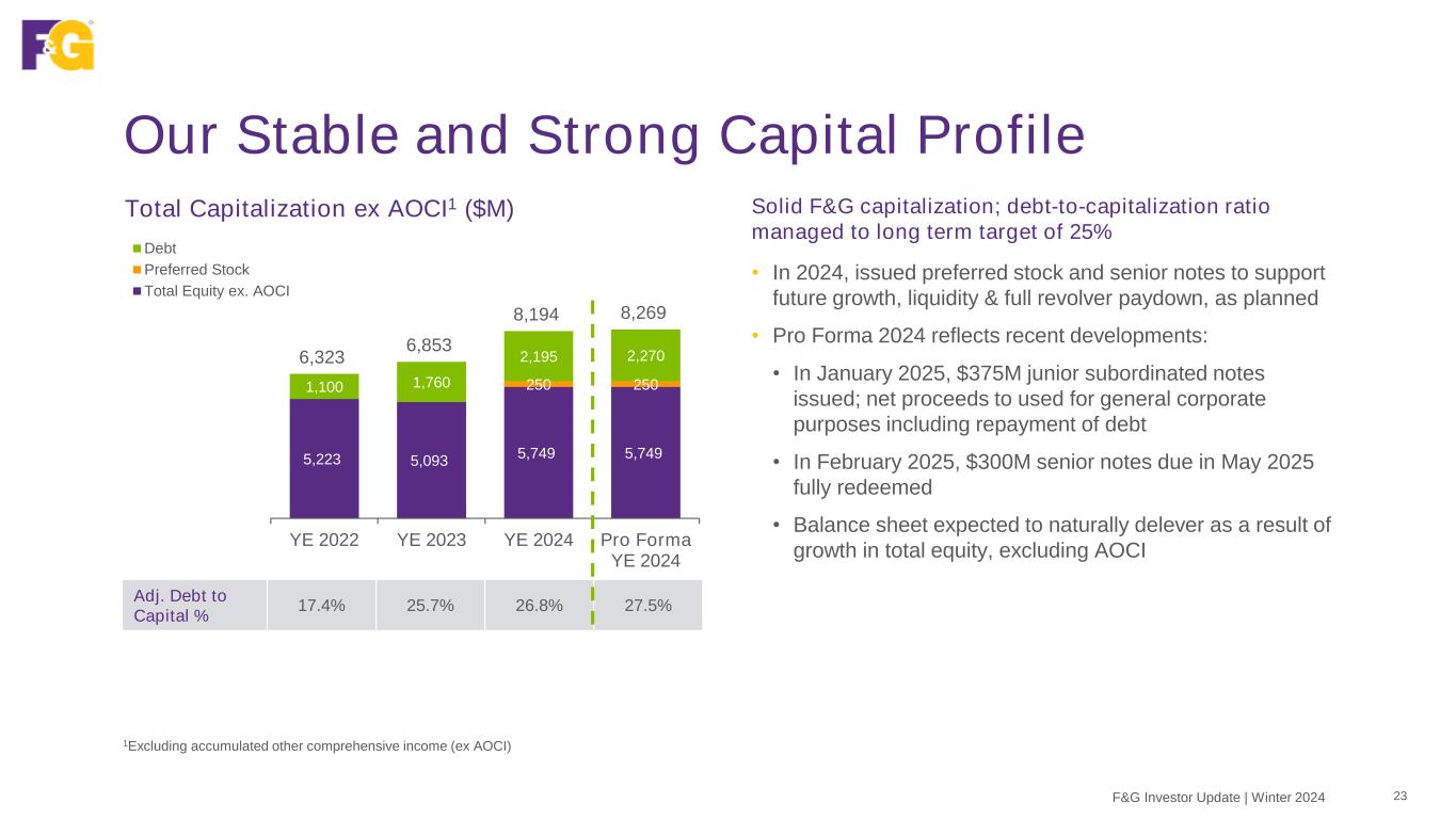 80 84 93 118 117 127 2019 2020 2021 2022 2023 FY2024 0 bps 20 bps 40 bps 60 bps 80 bps 100 bps 120 bps 140 bps 160 bps 180 bps 0.0% 1.0% 2.0% 3.0% 4.0% 5.0% 6.0% Our Expanding ROA Despite Volatile Rates F&G’s primary “spread model” generates stable return on assets (ROA) despite volatility in interest rates • 2019-2021: Maintained adjusted ROA despite precipitous drop in interest rates • 2022-2024: Expanded adjusted ROA from scale, accretive flow reinsurance and owned distribution • FY2024 adjusted ROA at 127 bps; steady margin expansion Adjusted Return on Assets1 vs. 10-year UST Yield 1Attributable to common shareholders. Metric refers to adjusted return on assets ex significant items Adjusted Return on Assets (bps) F&G Investor Update | Winter 2024 22 10-Year UST Maintained ROA in falling interest rate environment Expanding ROA as margins benefit from scale, accretive flow reinsurance and owned distribution