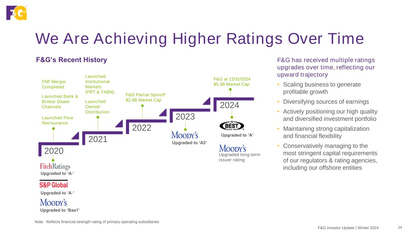 Our Stable and Strong Capital Profile 23F&G Investor Update | Winter 2024 1Excluding accumulated other comprehensive income (ex AOCI) Total Capitalization ex AOCI1 ($M) 5,223 5,093 5,749 5,749 250 250 1,100 1,760 2,195 2,270 6,323 6,853 8,194 8,269 YE 2022 YE 2023 YE 2024 Pro Forma YE 2024 Debt Preferred Stock Total Equity ex. AOCI Adj. Debt to Capital % 17.4% 25.7% 26.8% 27.5% Solid F&G capitalization; debt-to-capitalization ratio managed to long term target of 25% • In 2024, issued preferred stock and senior notes to support future growth, liquidity & full revolver paydown, as planned • Pro Forma 2024 reflects recent developments: • In January 2025, $375M junior subordinated notes issued; net proceeds to used for general corporate purposes including repayment of debt • In February 2025, $300M senior notes due in May 2025 fully redeemed • Balance sheet expected to naturally delever as a result of growth in total equity, excluding AOCI