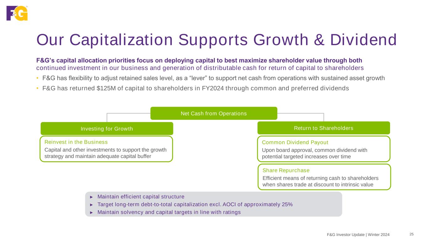 2020 2021 2022 2023 2024 We Are Achieving Higher Ratings Over Time 24F&G Investor Update | Winter 2024 Upgraded to ‘A-’ FNF Merger Completed F&G Partial Spinoff $2.4B Market Cap Launched Flow Reinsurance Launched Owned Distribution F&G at 12/31/2024 $5.3B Market Cap Upgraded to ‘A-’ Upgraded to ‘Baa1’ Upgraded to ‘A3’ Upgraded to ‘A’ Launched Bank & Broker Dealer Channels Launched Institutional Markets (PRT & FABN) F&G has received multiple ratings upgrades over time, reflecting our upward trajectory • Scaling business to generate profitable growth • Diversifying sources of earnings • Actively positioning our high quality and diversified investment portfolio • Maintaining strong capitalization and financial flexibility • Conservatively managing to the most stringent capital requirements of our regulators & rating agencies, including our offshore entities Upgraded long-term issuer rating Note: Reflects financial strength rating of primary operating subsidiaries F&G’s Recent History
