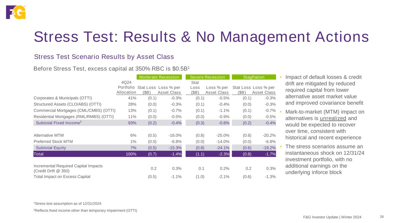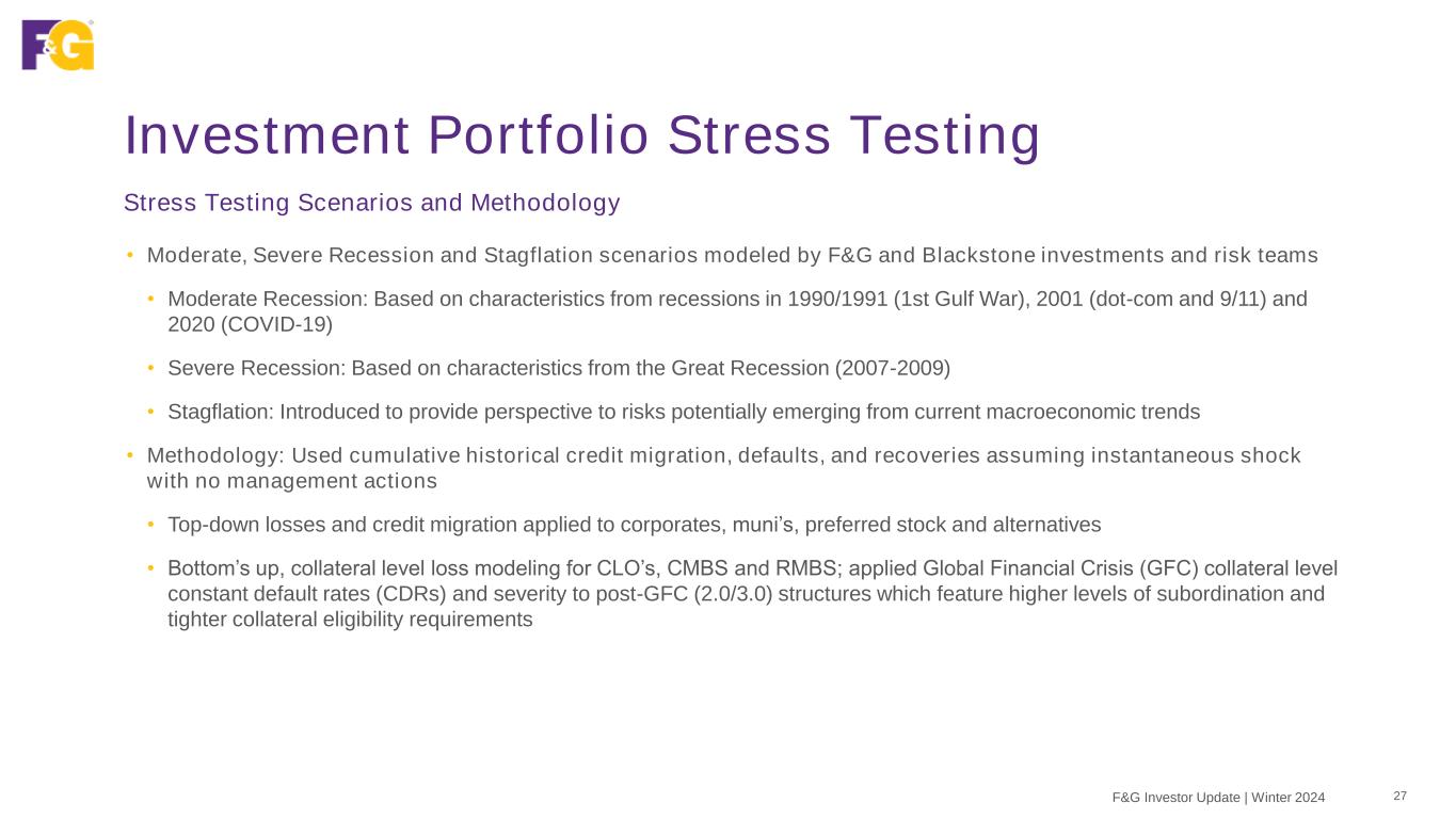 Investment Portfolio Stress Testing 27F&G Investor Update | Winter 2024 • Moderate, Severe Recession and Stagflation scenarios modeled by F&G and Blackstone investments and risk teams • Moderate Recession: Based on characteristics from recessions in 1990/1991 (1st Gulf War), 2001 (dot-com and 9/11) and 2020 (COVID-19) • Severe Recession: Based on characteristics from the Great Recession (2007-2009) • Stagflation: Introduced to provide perspective to risks potentially emerging from current macroeconomic trends • Methodology: Used cumulative historical credit migration, defaults, and recoveries assuming instantaneous shock with no management actions • Top-down losses and credit migration applied to corporates, muni’s, preferred stock and alternatives • Bottom’s up, collateral level loss modeling for CLO’s, CMBS and RMBS; applied Global Financial Crisis (GFC) collateral level constant default rates (CDRs) and severity to post-GFC (2.0/3.0) structures which feature higher levels of subordination and tighter collateral eligibility requirements Stress Testing Scenarios and Methodology