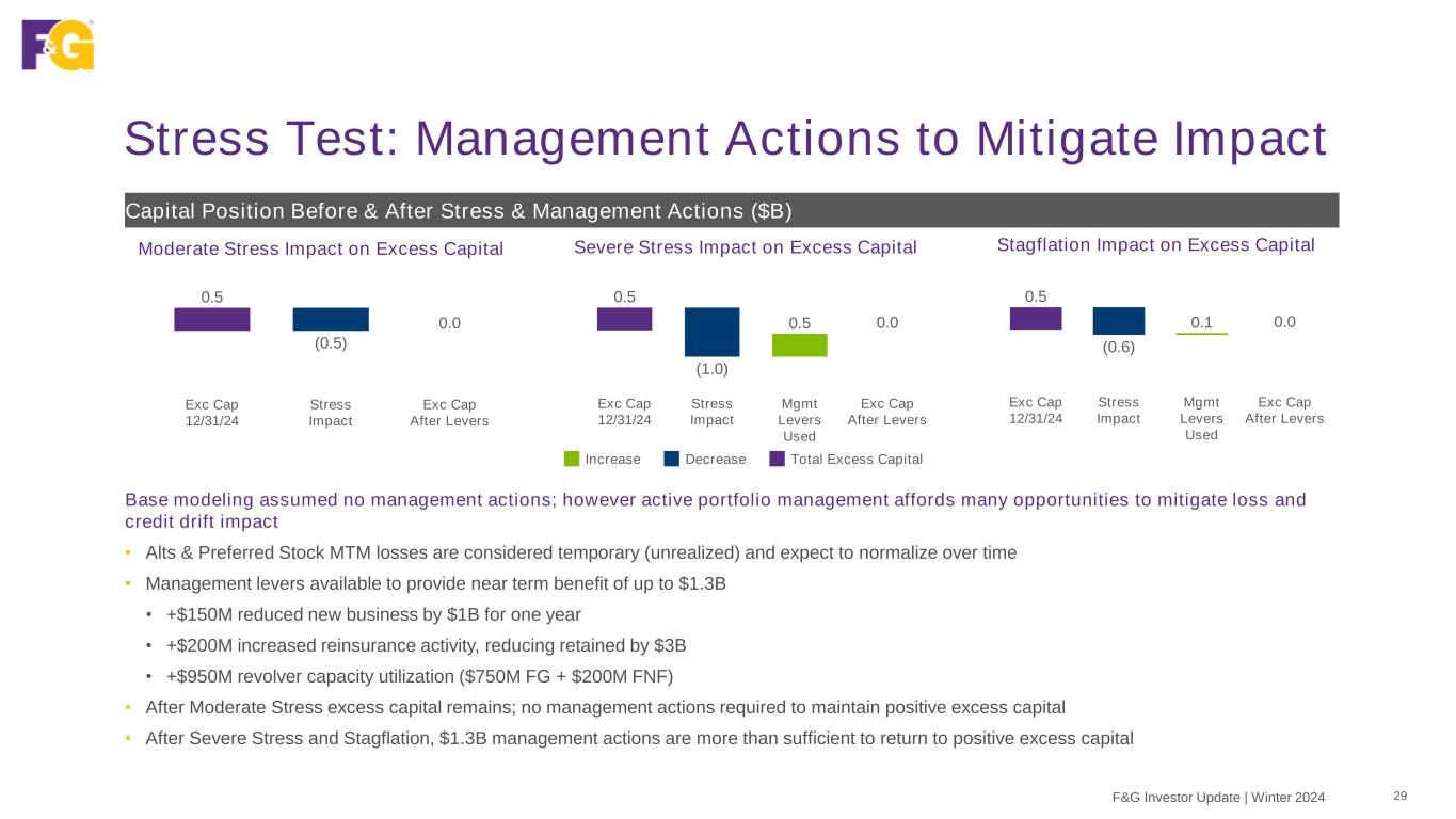 Stress Test: Results & No Management Actions 28F&G Investor Update | Winter 2024 Stress Test Scenario Results by Asset Class 1Stress test assumption as of 12/31/2024 2Reflects fixed income other than temporary impairment (OTTI) Before Stress Test, excess capital at 350% RBC is $0.5B1 Moderate Recession Severe Recession Stagflation 4Q24 Portfolio Allocation Stat Loss ($B) Loss % per Asset Class Stat Loss ($B) Loss % per Asset Class Stat Loss ($B) Loss % per Asset Class Corporates & Municipals (OTTI) 41% (0.1) -0.3% (0.1) -0.5% (0.1) -0.3% Structured Assets (CLO/ABS) (OTTI) 28% (0.0) -0.3% (0.1) -0.4% (0.0) -0.3% Commercial Mortgages (CML/CMBS) (OTTI) 13% (0.1) -0.7% (0.1) -1.1% (0.1) -0.7% Residential Mortgages (RML/RMBS) (OTTI) 11% (0.0) -0.5% (0.0) -0.9% (0.0) -0.5% Subtotal Fixed Income2 93% (0.2) -0.4% (0.3) -0.6% (0.2) -0.4% Alternative MTM 6% (0.5) -16.0% (0.8) -25.0% (0.6) -20.2% Preferred Stock MTM 1% (0.0) -6.8% (0.0) -14.0% (0.0) -6.8% Subtotal Equity 7% (0.5) -15.3% (0.8) -24.1% (0.6) -19.2% Total 100% (0.7) -1.4% (1.1) -2.3% (0.8) -1.7% Incremental Required Capital Impacts (Credit Drift @ 350) 0.2 0.3% 0.1 0.2% 0.2 0.3% Total Impact on Excess Capital (0.5) -1.1% (1.0) -2.1% (0.6) -1.3% • Impact of default losses & credit drift are mitigated by reduced required capital from lower alternative asset market value and improved covariance benefit • Mark-to-market (MTM) impact on alternatives is unrealized and would be expected to recover over time, consistent with historical and recent experience • The stress scenarios assume an instantaneous shock on 12/31/24 investment portfolio, with no additional earnings on the underlying inforce block