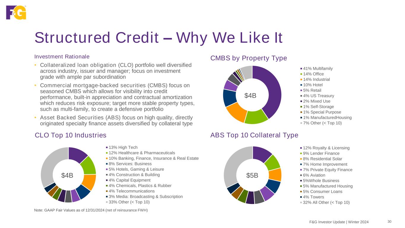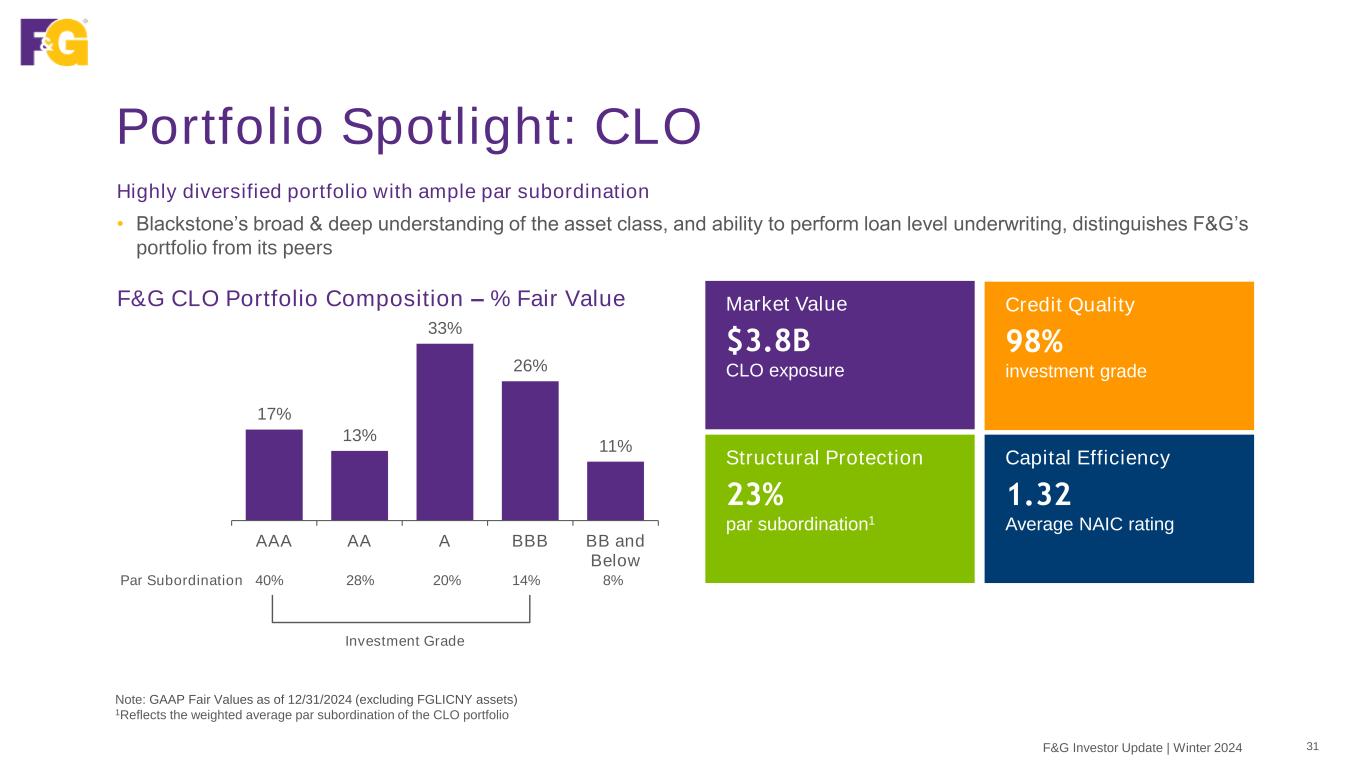 12% Royalty & Licensing 9% Lender Finance 8% Residential Solar 7% Home Improvement 7% Private Equity Finance 6% Aviation 5%Whole Business 5% Manufactured Housing 5% Consumer Loans 4% Towers 32% All Other (< Top 10) Structured Credit – Why We Like It 30F&G Investor Update | Winter 2024 Investment Rationale • Collateralized loan obligation (CLO) portfolio well diversified across industry, issuer and manager; focus on investment grade with ample par subordination • Commercial mortgage-backed securities (CMBS) focus on seasoned CMBS which allows for visibility into credit performance, built-in appreciation and contractual amortization which reduces risk exposure; target more stable property types, such as multi-family, to create a defensive portfolio • Asset Backed Securities (ABS) focus on high quality, directly originated specialty finance assets diversified by collateral type CMBS by Property Type CLO Top 10 Industries ABS Top 10 Collateral Type Note: GAAP Fair Values as of 12/31/2024 (net of reinsurance FWH) 13% High Tech 12% Healthcare & Pharmaceuticals 10% Banking, Finance, Insurance & Real Estate 8% Services: Business 5% Hotels, Gaming & Leisure 4% Construction & Building 4% Capital Equipment 4% Chemicals, Plastics & Rubber 4% Telecommunications 3% Media: Broadcasting & Subscription 33% Other (< Top 10) $4B $5B $4B 41% Multifamily 14% Office 14% Industrial 10% Hotel 5% Retail 4% US Treasury 2% Mixed Use 1% Self-Storage 1% Special Purpose 1% ManufacturedHousing 7% Other (< Top 10)