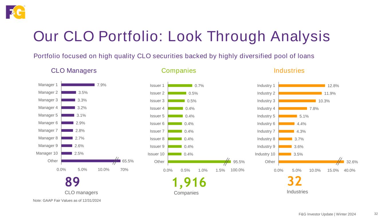 Portfolio Spotlight: CLO 31F&G Investor Update | Winter 2024 Highly diversified portfolio with ample par subordination • Blackstone’s broad & deep understanding of the asset class, and ability to perform loan level underwriting, distinguishes F&G’s portfolio from its peers F&G CLO Portfolio Composition – % Fair Value Note: GAAP Fair Values as of 12/31/2024 (excluding FGLICNY assets) 1Reflects the weighted average par subordination of the CLO portfolio 17% 13% 33% 26% 11% AAA AA A BBB BB and Below Investment Grade Par Subordination 40% 28% 20% 14% 8% Credit Quality 98% investment grade Structural Protection 23% par subordination1 Capital Efficiency 1.32 Average NAIC rating Market Value $3.8B CLO exposure