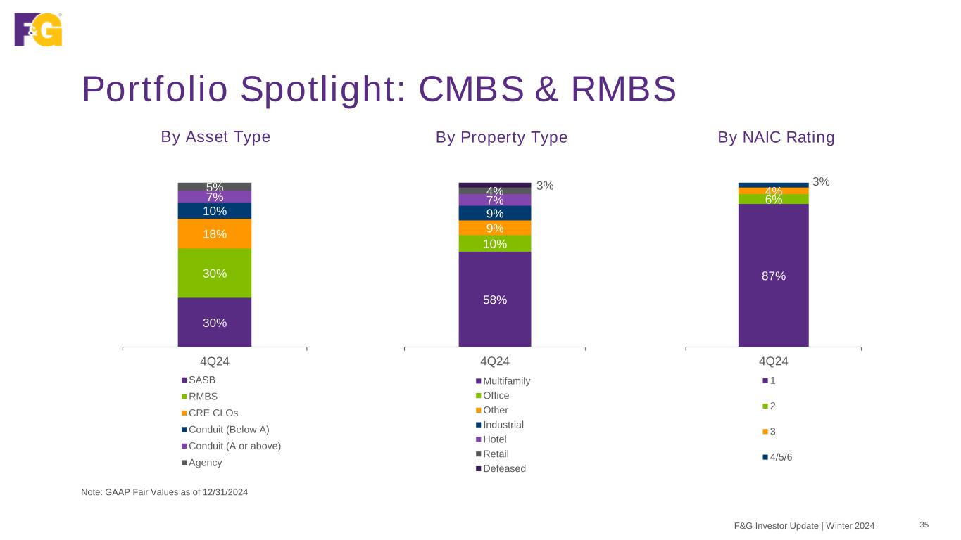 Portfolio Spotlight: Real Estate Debt 34F&G Investor Update | Winter 2024 Blackstone Real Estate Debt Strategies (BREDS) has assembled a high-quality portfolio with diversified exposure across asset classes and properties Note: GAAP Fair Values as of 12/31/2024 36% CMBS 28% RML 16% CML 15% RMBS 5% NNN $11B Duration 3.8 years Quality 1.3 Average NAIC rating Market Value $11.2B Real estate portfolio Weighted Average Life 5.7 years