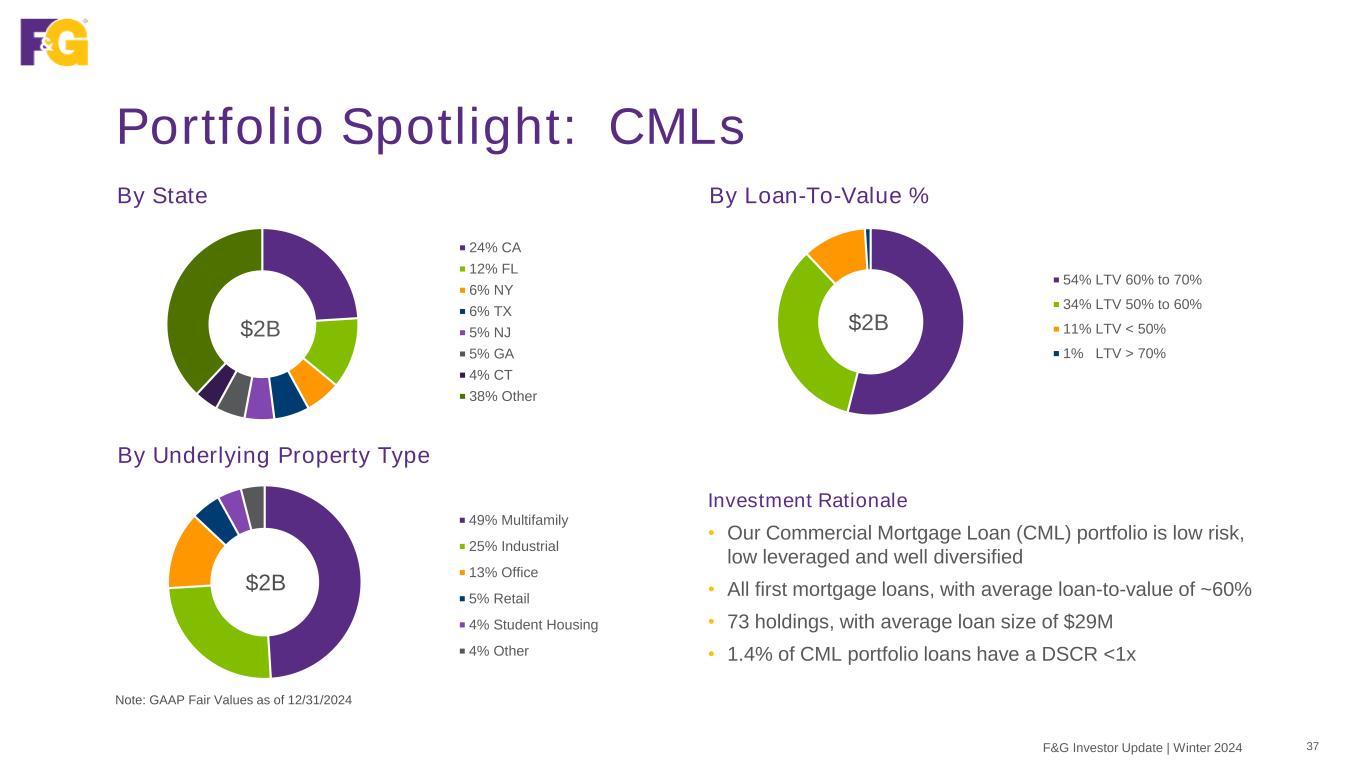 Portfolio Spotlight: CMBS 36F&G Investor Update | Winter 2024 Prudent asset selection has led to more multifamily exposure and less retail vs. Conduit CMBS market averages Portfolio Construction Comparison1 Note: GAAP Fair Values as of 12/31/2024 1BAML Conduit Data as of 12/31/2024 41% 5% 14% 24% Multifamily Retail F&G Post-Crisis Conduit CMBS Credit Quality 91% Investment grade (NRSRO) Quality 1.5 Average NAIC rating Market Value $4.0B CMBS portfolio Credit focus A NRSRO rating