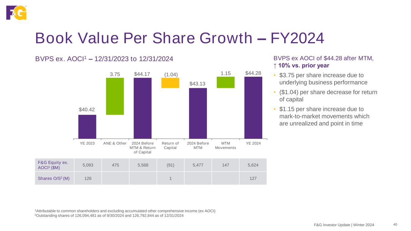Book Value Per Share Growth – FY2024 40F&G Investor Update | Winter 2024 BVPS ex AOCI of $44.28 after MTM, ↑ 10% vs. prior year • $3.75 per share increase due to underlying business performance • ($1.04) per share decrease for return of capital • $1.15 per share increase due to mark-to-market movements which are unrealized and point in time 1Attributable to common shareholders and excluding accumulated other comprehensive income (ex AOCI) 2Outstanding shares of 126,094,481 as of 9/30/2024 and 126,792,844 as of 12/31/2024 BVPS ex. AOCI1 – 12/31/2023 to 12/31/2024 $40.42 $44.17 $43.13 $44.28 3.75 (1.04) 1.15 $38.00 $39.00 $40.00 $41.00 $42.00 $43.00 $44.00 $45.00 YE 2023 ANE & Other 2024 Before MTM & Return of Capital Return of Capital 2024 Before MTM MTM Movements YE 2024 F&G Equity ex. AOCI1 ($M) 5,093 475 5,568 (91) 5,477 147 5,624 Shares O/S2 (M) 126 1 127
