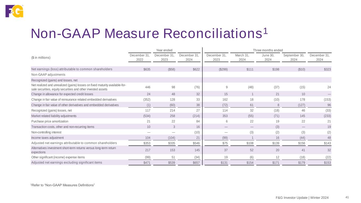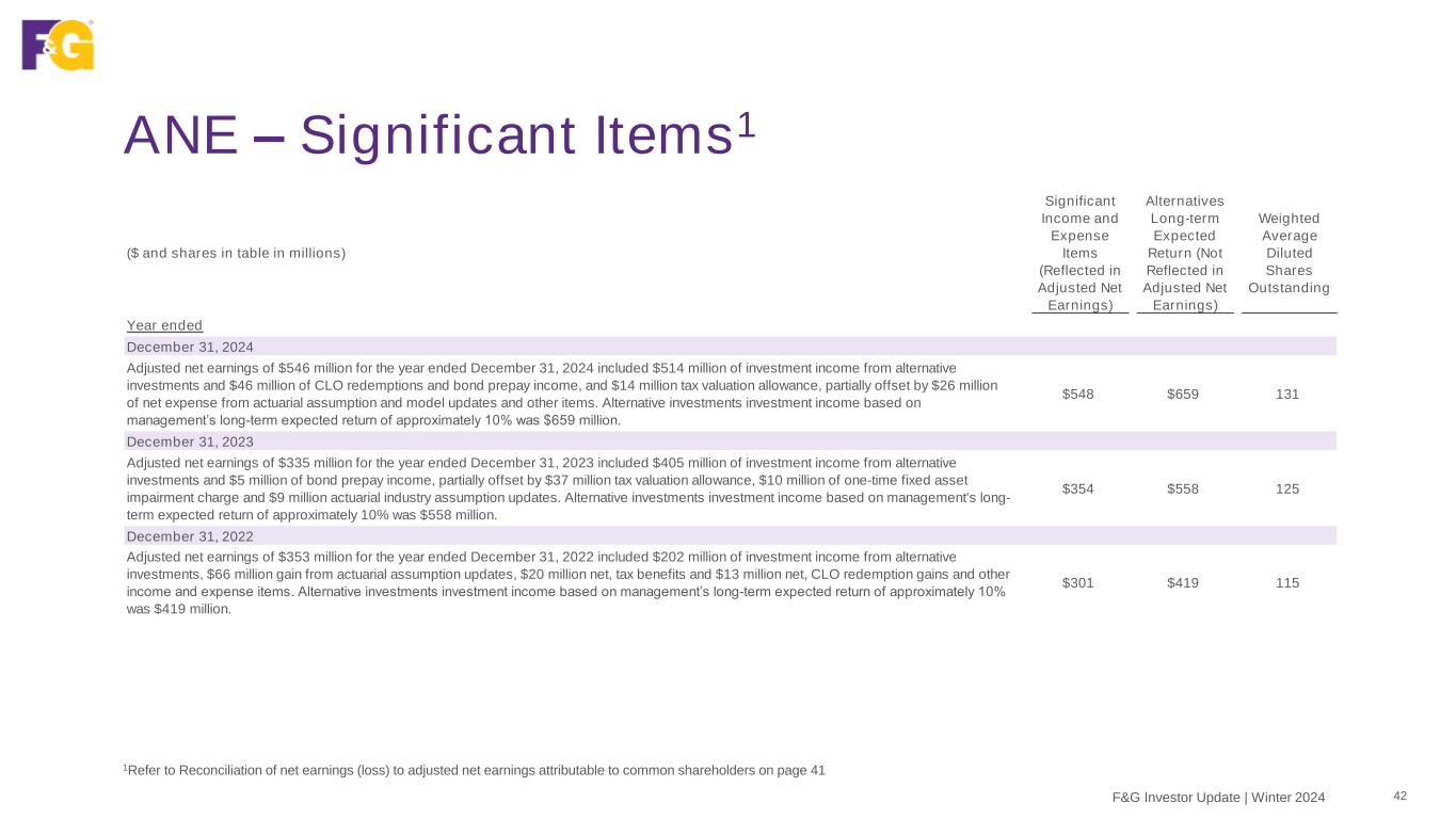 Non-GAAP Measure Reconciliations1 41F&G Investor Update | Winter 2024 1Refer to “Non-GAAP Measures Definitions” Year ended Three months ended ($ in millions) December 31, 2022 December 31, 2023 December 31, 2024 December 31, 2023 March 31, 2024 June 30, 2024 September 30, 2024 December 31, 2024 Net earnings (loss) attributable to common shareholders $635 ($58) $622 ($299) $111 $198 ($10) $323 Non-GAAP adjustments Recognized (gains) and losses, net Net realized and unrealized (gains) losses on fixed maturity available-for- sale securities, equity securities and other invested assets 446 98 (76) 9 (48) (37) (15) 24 Change in allowance for expected credit losses 24 48 32 15 1 21 10 — Change in fair value of reinsurance related embedded derivatives (352) 128 33 162 18 (10) 178 (153) Change in fair value of other derivatives and embedded derivatives (1) (60) 38 (72) 61 8 (127) 96 Recognized (gains) losses, net 117 214 27 114 32 (18) 46 (33) Market related liability adjustments (534) 258 (214) 353 (55) (71) 145 (233) Purchase price amortization 21 22 84 6 22 19 22 21 Transaction costs, other and non-recurring items 10 3 16 — — (3) — 19 Non-controlling interest — — (10) — (3) (2) (3) (2) Income taxes adjustment 104 (104) 21 (99) 1 16 (44) 48 Adjusted net earnings attributable to common shareholders $353 $335 $546 $75 $108 $139 $156 $143 Alternatives investment short-term returns versus long-term return expections 217 153 145 37 52 20 41 32 Other significant (income) expense items (99) 51 (34) 19 (6) 12 (18) (22) Adjusted net earnings excluding significant items $471 $539 $657 $131 $154 $171 $179 $153