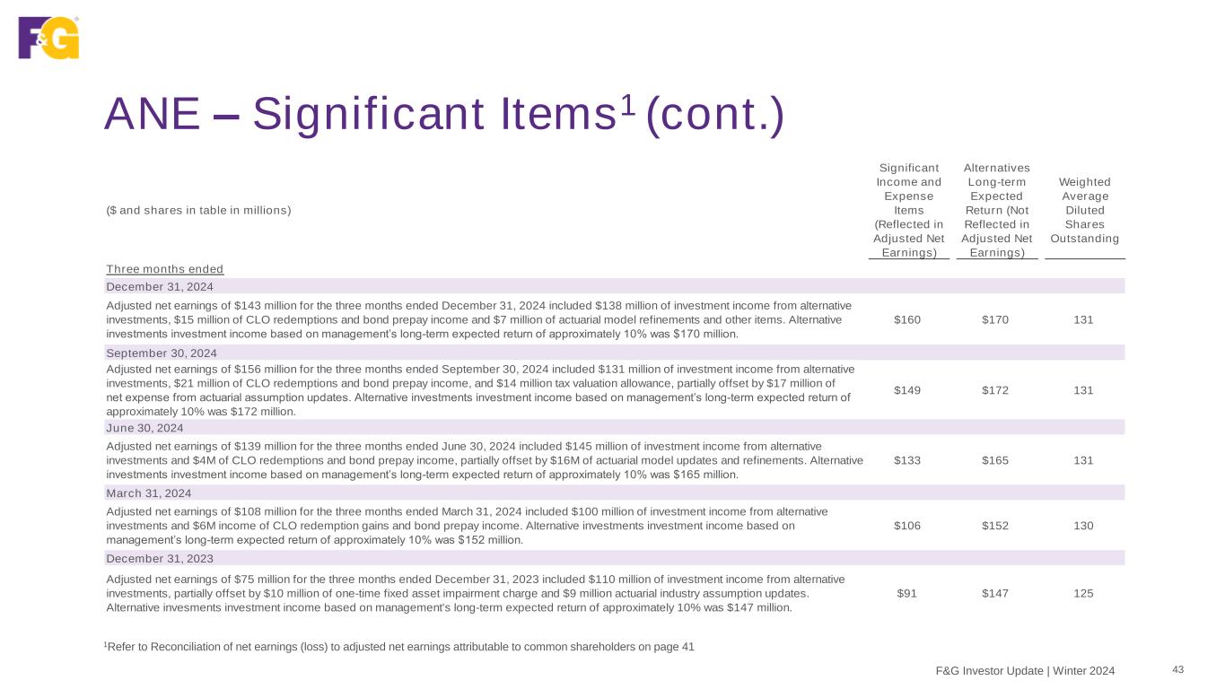 ANE – Significant Items1 42F&G Investor Update | Winter 2024 1Refer to Reconciliation of net earnings (loss) to adjusted net earnings attributable to common shareholders on page 41 ($ and shares in table in millions) Significant Income and Expense Items (Reflected in Adjusted Net Earnings) Alternatives Long-term Expected Return (Not Reflected in Adjusted Net Earnings) Weighted Average Diluted Shares Outstanding Year ended December 31, 2024 Adjusted net earnings of $546 million for the year ended December 31, 2024 included $514 million of investment income from alternative investments and $46 million of CLO redemptions and bond prepay income, and $14 million tax valuation allowance, partially offset by $26 million of net expense from actuarial assumption and model updates and other items. Alternative investments investment income based on management’s long-term expected return of approximately 10% was $659 million. $548 $659 131 December 31, 2023 Adjusted net earnings of $335 million for the year ended December 31, 2023 included $405 million of investment income from alternative investments and $5 million of bond prepay income, partially offset by $37 million tax valuation allowance, $10 million of one-time fixed asset impairment charge and $9 million actuarial industry assumption updates. Alternative investments investment income based on management's long- term expected return of approximately 10% was $558 million. $354 $558 125 December 31, 2022 Adjusted net earnings of $353 million for the year ended December 31, 2022 included $202 million of investment income from alternative investments, $66 million gain from actuarial assumption updates, $20 million net, tax benefits and $13 million net, CLO redemption gains and other income and expense items. Alternative investments investment income based on management’s long-term expected return of approximately 10% was $419 million. $301 $419 115