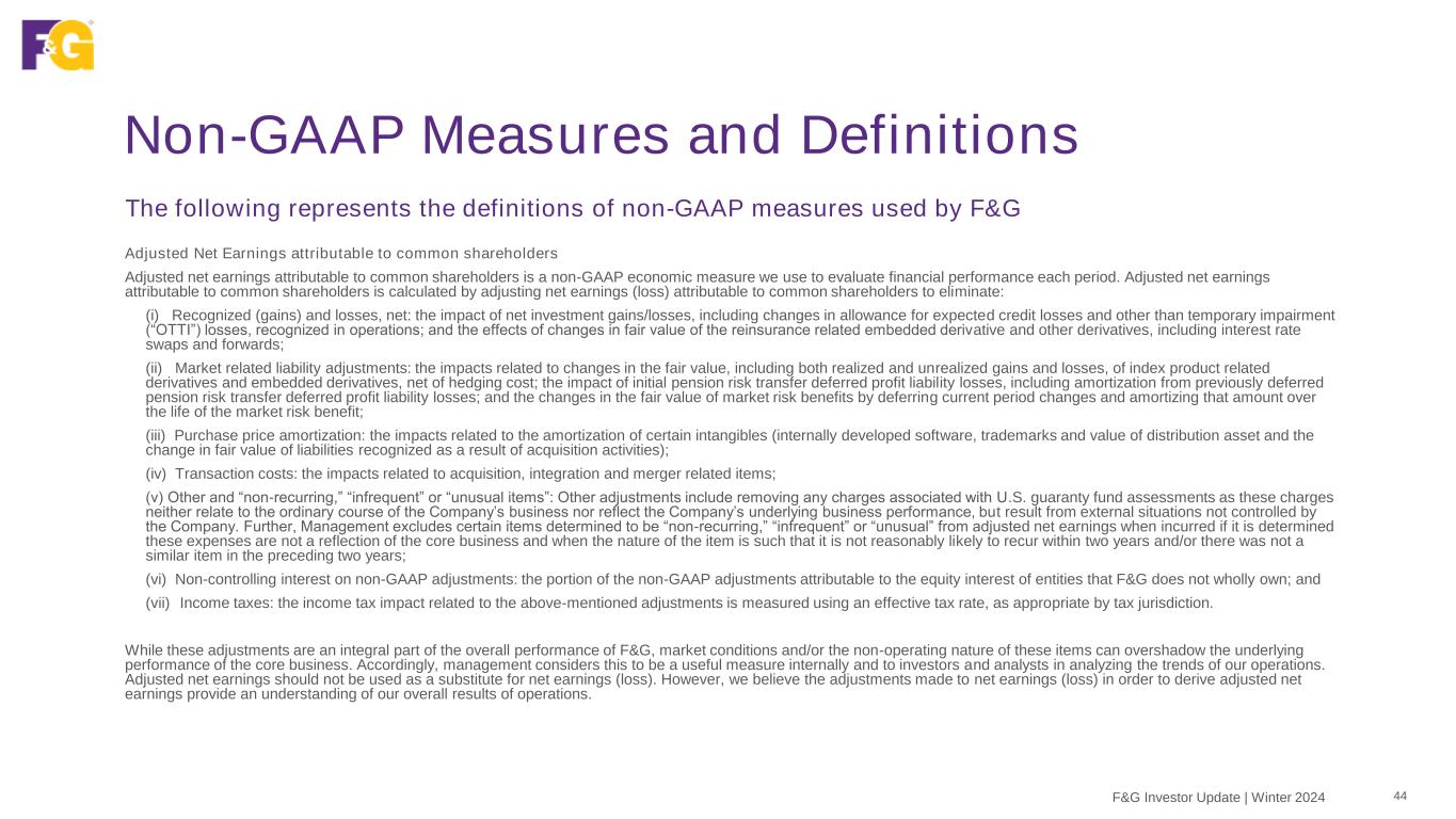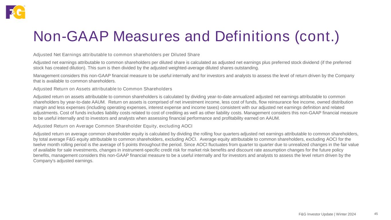 Non-GAAP Measures and Definitions 44F&G Investor Update | Winter 2024 The following represents the definitions of non-GAAP measures used by F&G Adjusted Net Earnings attributable to common shareholders Adjusted net earnings attributable to common shareholders is a non-GAAP economic measure we use to evaluate financial performance each period. Adjusted net earnings attributable to common shareholders is calculated by adjusting net earnings (loss) attributable to common shareholders to eliminate: (i) Recognized (gains) and losses, net: the impact of net investment gains/losses, including changes in allowance for expected credit losses and other than temporary impairment (“OTTI”) losses, recognized in operations; and the effects of changes in fair value of the reinsurance related embedded derivative and other derivatives, including interest rate swaps and forwards; (ii) Market related liability adjustments: the impacts related to changes in the fair value, including both realized and unrealized gains and losses, of index product related derivatives and embedded derivatives, net of hedging cost; the impact of initial pension risk transfer deferred profit liability losses, including amortization from previously deferred pension risk transfer deferred profit liability losses; and the changes in the fair value of market risk benefits by deferring current period changes and amortizing that amount over the life of the market risk benefit; (iii) Purchase price amortization: the impacts related to the amortization of certain intangibles (internally developed software, trademarks and value of distribution asset and the change in fair value of liabilities recognized as a result of acquisition activities); (iv) Transaction costs: the impacts related to acquisition, integration and merger related items; (v) Other and “non-recurring,” “infrequent” or “unusual items”: Other adjustments include removing any charges associated with U.S. guaranty fund assessments as these charges neither relate to the ordinary course of the Company’s business nor reflect the Company’s underlying business performance, but result from external situations not controlled by the Company. Further, Management excludes certain items determined to be “non-recurring,” “infrequent” or “unusual” from adjusted net earnings when incurred if it is determined these expenses are not a reflection of the core business and when the nature of the item is such that it is not reasonably likely to recur within two years and/or there was not a similar item in the preceding two years; (vi) Non-controlling interest on non-GAAP adjustments: the portion of the non-GAAP adjustments attributable to the equity interest of entities that F&G does not wholly own; and (vii) Income taxes: the income tax impact related to the above-mentioned adjustments is measured using an effective tax rate, as appropriate by tax jurisdiction. While these adjustments are an integral part of the overall performance of F&G, market conditions and/or the non-operating nature of these items can overshadow the underlying performance of the core business. Accordingly, management considers this to be a useful measure internally and to investors and analysts in analyzing the trends of our operations. Adjusted net earnings should not be used as a substitute for net earnings (loss). However, we believe the adjustments made to net earnings (loss) in order to derive adjusted net earnings provide an understanding of our overall results of operations.