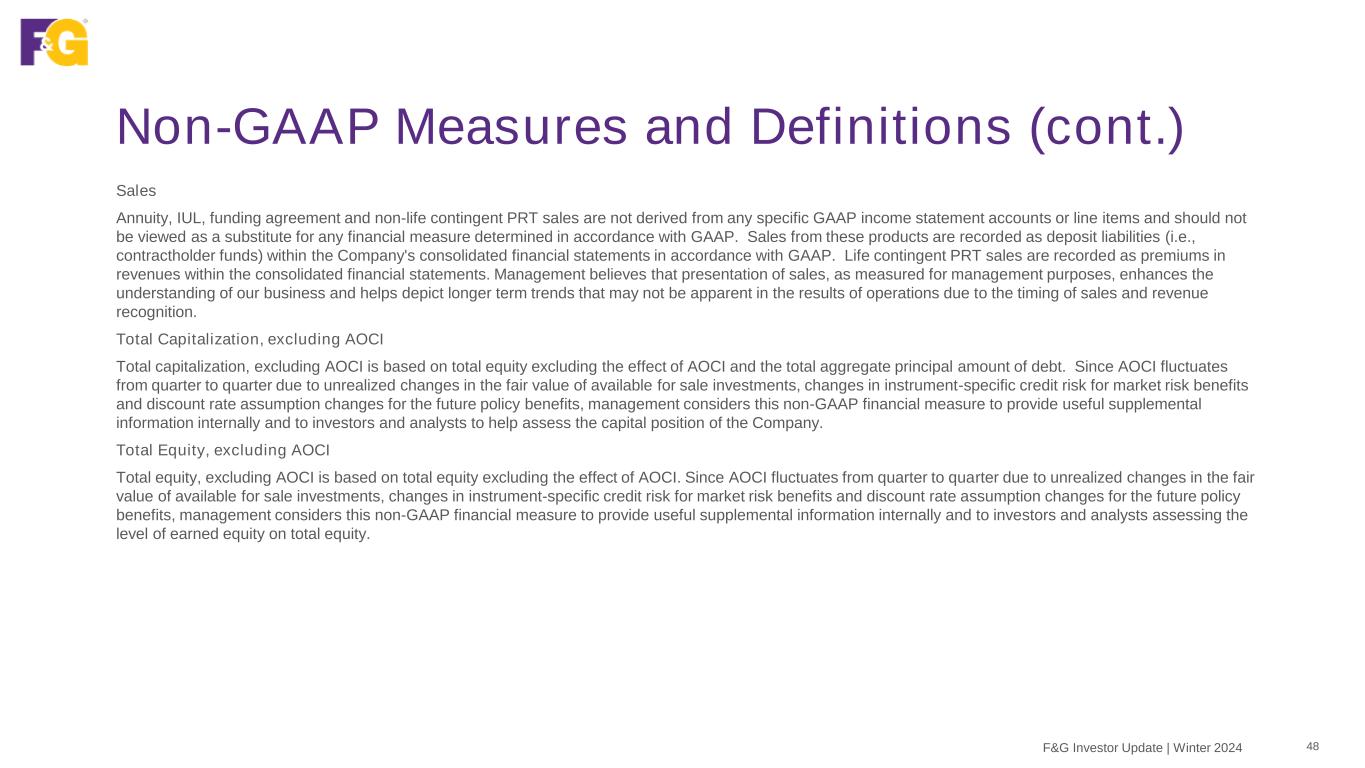 Non-GAAP Measures and Definitions (cont.) 48F&G Investor Update | Winter 2024 Sales Annuity, IUL, funding agreement and non-life contingent PRT sales are not derived from any specific GAAP income statement accounts or line items and should not be viewed as a substitute for any financial measure determined in accordance with GAAP. Sales from these products are recorded as deposit liabilities (i.e., contractholder funds) within the Company's consolidated financial statements in accordance with GAAP. Life contingent PRT sales are recorded as premiums in revenues within the consolidated financial statements. Management believes that presentation of sales, as measured for management purposes, enhances the understanding of our business and helps depict longer term trends that may not be apparent in the results of operations due to the timing of sales and revenue recognition. Total Capitalization, excluding AOCI Total capitalization, excluding AOCI is based on total equity excluding the effect of AOCI and the total aggregate principal amount of debt. Since AOCI fluctuates from quarter to quarter due to unrealized changes in the fair value of available for sale investments, changes in instrument-specific credit risk for market risk benefits and discount rate assumption changes for the future policy benefits, management considers this non-GAAP financial measure to provide useful supplemental information internally and to investors and analysts to help assess the capital position of the Company. Total Equity, excluding AOCI Total equity, excluding AOCI is based on total equity excluding the effect of AOCI. Since AOCI fluctuates from quarter to quarter due to unrealized changes in the fair value of available for sale investments, changes in instrument-specific credit risk for market risk benefits and discount rate assumption changes for the future policy benefits, management considers this non-GAAP financial measure to provide useful supplemental information internally and to investors and analysts assessing the level of earned equity on total equity.
