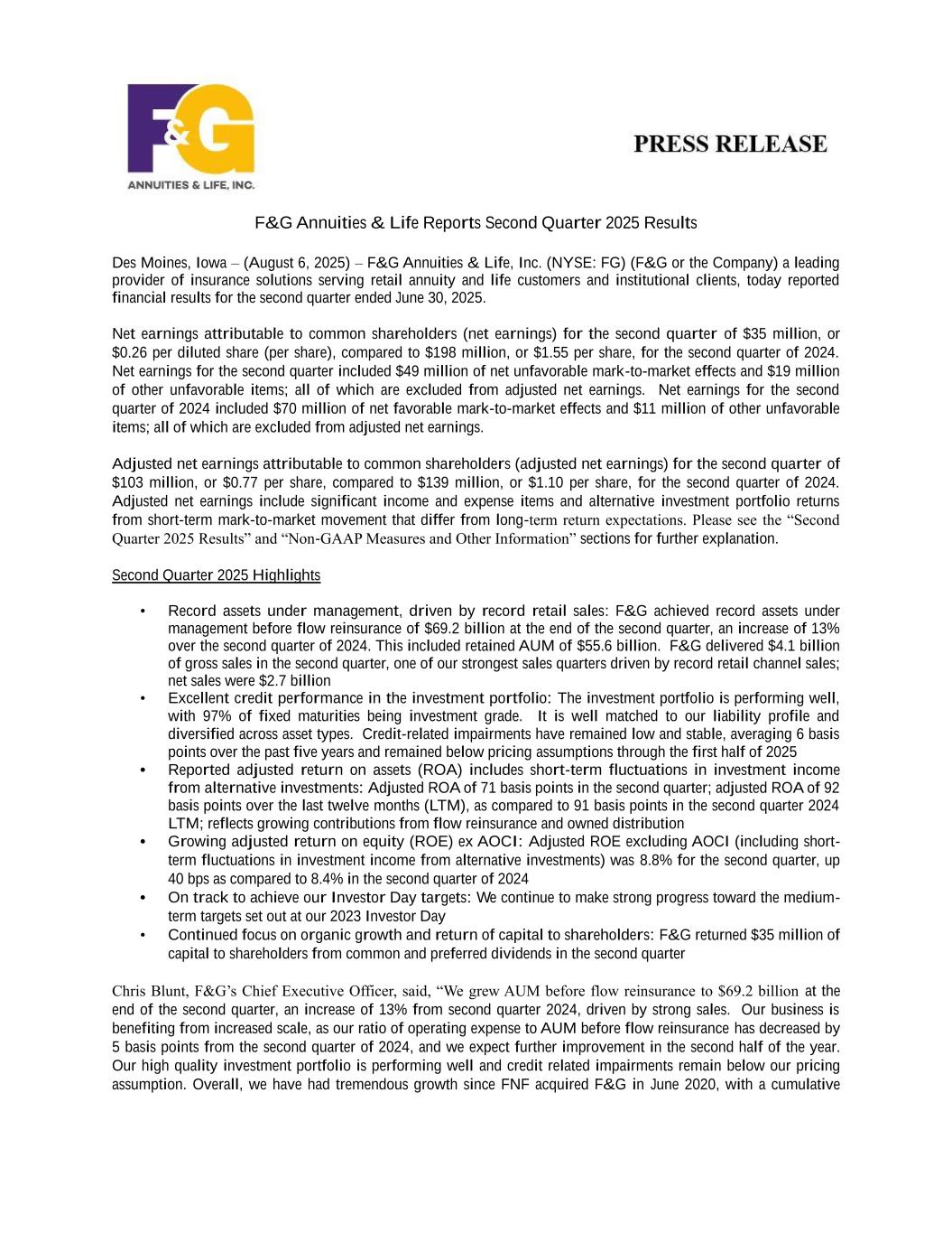 F&G Annuities & Life Reports Second Quarter 2025 Results Des Moines, Iowa – (August 6, 2025) – F&G Annuities & Life, Inc. (NYSE: FG) (F&G or the Company) a leading provider of insurance solutions serving retail annuity and life customers and institutional clients, today reported financial results for the second quarter ended June 30, 2025. Net earnings attributable to common shareholders (net earnings) for the second quarter of $35 million, or $0.26 per diluted share (per share), compared to $198 million, or $1.55 per share, for the second quarter of 2024. Net earnings for the second quarter included $49 million of net unfavorable mark-to-market effects and $19 million of other unfavorable items; all of which are excluded from adjusted net earnings. Net earnings for the second quarter of 2024 included $70 million of net favorable mark-to-market effects and $11 million of other unfavorable items; all of which are excluded from adjusted net earnings. Adjusted net earnings attributable to common shareholders (adjusted net earnings) for the second quarter of $103 million, or $0.77 per share, compared to $139 million, or $1.10 per share, for the second quarter of 2024. Adjusted net earnings include significant income and expense items and alternative investment portfolio returns from short-term mark-to-market movement that differ from long-term return expectations. Please see the “Second Quarter 2025 Results” and “Non-GAAP Measures and Other Information” sections for further explanation. Second Quarter 2025 Highlights • Record assets under management, driven by record retail sales: F&G achieved record assets under management before flow reinsurance of $69.2 billion at the end of the second quarter, an increase of 13% over the second quarter of 2024. This included retained AUM of $55.6 billion. F&G delivered $4.1 billion of gross sales in the second quarter, one of our strongest sales quarters driven by record retail channel sales; net sales were $2.7 billion • Excellent credit performance in the investment portfolio: The investment portfolio is performing well, with 97% of fixed maturities being investment grade. It is well matched to our liability profile and diversified across asset types. Credit-related impairments have remained low and stable, averaging 6 basis points over the past five years and remained below pricing assumptions through the first half of 2025 • Reported adjusted return on assets (ROA) includes short-term fluctuations in investment income from alternative investments: Adjusted ROA of 71 basis points in the second quarter; adjusted ROA of 92 basis points over the last twelve months (LTM), as compared to 91 basis points in the second quarter 2024 LTM; reflects growing contributions from flow reinsurance and owned distribution • Growing adjusted return on equity (ROE) ex AOCI: Adjusted ROE excluding AOCI (including short- term fluctuations in investment income from alternative investments) was 8.8% for the second quarter, up 40 bps as compared to 8.4% in the second quarter of 2024 • On track to achieve our Investor Day targets: We continue to make strong progress toward the medium- term targets set out at our 2023 Investor Day • Continued focus on organic growth and return of capital to shareholders: F&G returned $35 million of capital to shareholders from common and preferred dividends in the second quarter Chris Blunt, F&G’s Chief Executive Officer, said, “We grew AUM before flow reinsurance to $69.2 billion at the end of the second quarter, an increase of 13% from second quarter 2024, driven by strong sales. Our business is benefiting from increased scale, as our ratio of operating expense to AUM before flow reinsurance has decreased by 5 basis points from the second quarter of 2024, and we expect further improvement in the second half of the year. Our high quality investment portfolio is performing well and credit related impairments remain below our pricing assumption. Overall, we have had tremendous growth since FNF acquired F&G in June 2020, with a cumulative