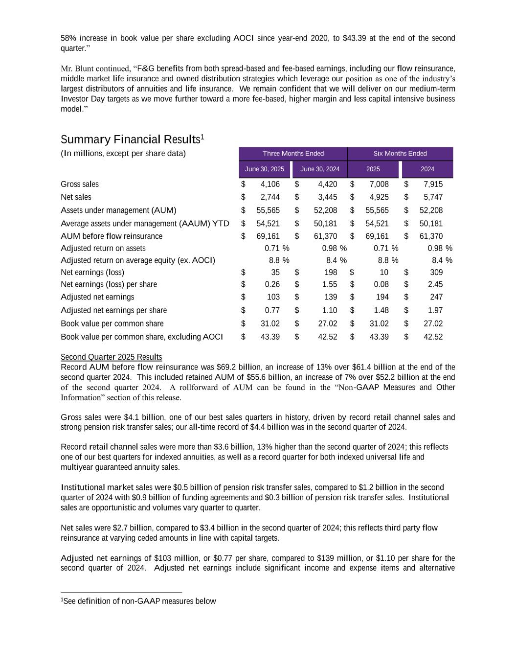 58% increase in book value per share excluding AOCI since year-end 2020, to $43.39 at the end of the second quarter.” Mr. Blunt continued, “F&G benefits from both spread-based and fee-based earnings, including our flow reinsurance, middle market life insurance and owned distribution strategies which leverage our position as one of the industry’s largest distributors of annuities and life insurance. We remain confident that we will deliver on our medium-term Investor Day targets as we move further toward a more fee-based, higher margin and less capital intensive business model.” Summary Financial Results1 (In millions, except per share data) Three Months Ended Six Months Ended June 30, 2025 June 30, 2024 2025 2024 Gross sales $ 4,106 $ 4,420 $ 7,008 $ 7,915 Net sales $ 2,744 $ 3,445 $ 4,925 $ 5,747 Assets under management (AUM) $ 55,565 $ 52,208 $ 55,565 $ 52,208 Average assets under management (AAUM) YTD $ 54,521 $ 50,181 $ 54,521 $ 50,181 AUM before flow reinsurance $ 69,161 $ 61,370 $ 69,161 $ 61,370 Adjusted return on assets 0.71 % 0.98 % 0.71 % 0.98 % Adjusted return on average equity (ex. AOCI) 8.8 % 8.4 % 8.8 % 8.4 % Net earnings (loss) $ 35 $ 198 $ 10 $ 309 Net earnings (loss) per share $ 0.26 $ 1.55 $ 0.08 $ 2.45 Adjusted net earnings $ 103 $ 139 $ 194 $ 247 Adjusted net earnings per share $ 0.77 $ 1.10 $ 1.48 $ 1.97 Book value per common share $ 31.02 $ 27.02 $ 31.02 $ 27.02 Book value per common share, excluding AOCI $ 43.39 $ 42.52 $ 43.39 $ 42.52 Second Quarter 2025 Results Record AUM before flow reinsurance was $69.2 billion, an increase of 13% over $61.4 billion at the end of the second quarter 2024. This included retained AUM of $55.6 billion, an increase of 7% over $52.2 billion at the end of the second quarter 2024. A rollforward of AUM can be found in the “Non-GAAP Measures and Other Information” section of this release. Gross sales were $4.1 billion, one of our best sales quarters in history, driven by record retail channel sales and strong pension risk transfer sales; our all-time record of $4.4 billion was in the second quarter of 2024. Record retail channel sales were more than $3.6 billion, 13% higher than the second quarter of 2024; this reflects one of our best quarters for indexed annuities, as well as a record quarter for both indexed universal life and multiyear guaranteed annuity sales. Institutional market sales were $0.5 billion of pension risk transfer sales, compared to $1.2 billion in the second quarter of 2024 with $0.9 billion of funding agreements and $0.3 billion of pension risk transfer sales. Institutional sales are opportunistic and volumes vary quarter to quarter. Net sales were $2.7 billion, compared to $3.4 billion in the second quarter of 2024; this reflects third party flow reinsurance at varying ceded amounts in line with capital targets. Adjusted net earnings of $103 million, or $0.77 per share, compared to $139 million, or $1.10 per share for the second quarter of 2024. Adjusted net earnings include significant income and expense items and alternative 1See definition of non-GAAP measures below