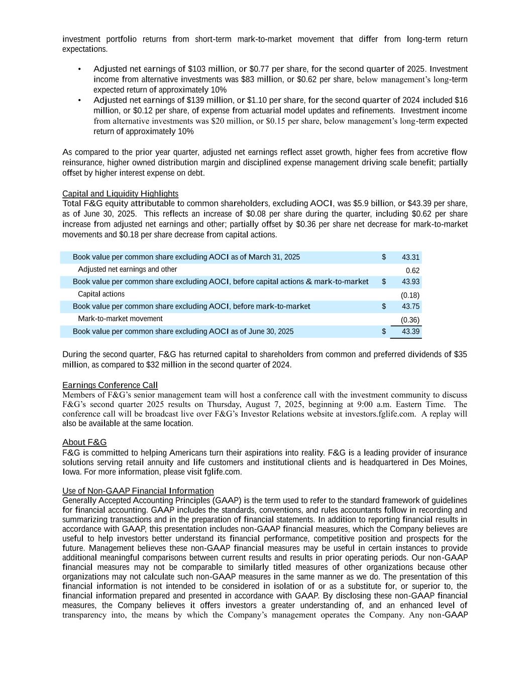 investment portfolio returns from short-term mark-to-market movement that differ from long-term return expectations. • Adjusted net earnings of $103 million, or $0.77 per share, for the second quarter of 2025. Investment income from alternative investments was $83 million, or $0.62 per share, below management’s long-term expected return of approximately 10% • Adjusted net earnings of $139 million, or $1.10 per share, for the second quarter of 2024 included $16 million, or $0.12 per share, of expense from actuarial model updates and refinements. Investment income from alternative investments was $20 million, or $0.15 per share, below management’s long-term expected return of approximately 10% As compared to the prior year quarter, adjusted net earnings reflect asset growth, higher fees from accretive flow reinsurance, higher owned distribution margin and disciplined expense management driving scale benefit; partially offset by higher interest expense on debt. Capital and Liquidity Highlights Total F&G equity attributable to common shareholders, excluding AOCI, was $5.9 billion, or $43.39 per share, as of June 30, 2025. This reflects an increase of $0.08 per share during the quarter, including $0.62 per share increase from adjusted net earnings and other; partially offset by $0.36 per share net decrease for mark-to-market movements and $0.18 per share decrease from capital actions. Book value per common share excluding AOCI as of March 31, 2025 $ 43.31 Adjusted net earnings and other 0.62 Book value per common share excluding AOCI, before capital actions & mark-to-market $ 43.93 Capital actions (0.18) Book value per common share excluding AOCI, before mark-to-market $ 43.75 Mark-to-market movement (0.36) Book value per common share excluding AOCI as of June 30, 2025 $ 43.39 During the second quarter, F&G has returned capital to shareholders from common and preferred dividends of $35 million, as compared to $32 million in the second quarter of 2024. Earnings Conference Call Members of F&G’s senior management team will host a conference call with the investment community to discuss F&G’s second quarter 2025 results on Thursday, August 7, 2025, beginning at 9:00 a.m. Eastern Time. The conference call will be broadcast live over F&G’s Investor Relations website at investors.fglife.com. A replay will also be available at the same location. About F&G F&G is committed to helping Americans turn their aspirations into reality. F&G is a leading provider of insurance solutions serving retail annuity and life customers and institutional clients and is headquartered in Des Moines, Iowa. For more information, please visit fglife.com. Use of Non-GAAP Financial Information Generally Accepted Accounting Principles (GAAP) is the term used to refer to the standard framework of guidelines for financial accounting. GAAP includes the standards, conventions, and rules accountants follow in recording and summarizing transactions and in the preparation of financial statements. In addition to reporting financial results in accordance with GAAP, this presentation includes non-GAAP financial measures, which the Company believes are useful to help investors better understand its financial performance, competitive position and prospects for the future. Management believes these non-GAAP financial measures may be useful in certain instances to provide additional meaningful comparisons between current results and results in prior operating periods. Our non-GAAP financial measures may not be comparable to similarly titled measures of other organizations because other organizations may not calculate such non-GAAP measures in the same manner as we do. The presentation of this financial information is not intended to be considered in isolation of or as a substitute for, or superior to, the financial information prepared and presented in accordance with GAAP. By disclosing these non-GAAP financial measures, the Company believes it offers investors a greater understanding of, and an enhanced level of transparency into, the means by which the Company’s management operates the Company. Any non-GAAP