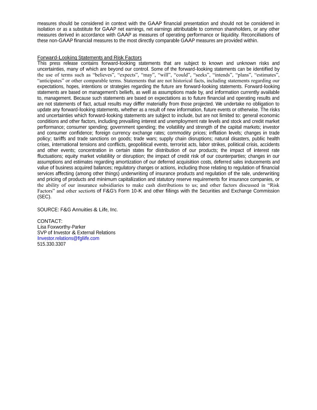 measures should be considered in context with the GAAP financial presentation and should not be considered in isolation or as a substitute for GAAP net earnings, net earnings attributable to common shareholders, or any other measures derived in accordance with GAAP as measures of operating performance or liquidity. Reconciliations of these non-GAAP financial measures to the most directly comparable GAAP measures are provided within. Forward-Looking Statements and Risk Factors This press release contains forward-looking statements that are subject to known and unknown risks and uncertainties, many of which are beyond our control. Some of the forward-looking statements can be identified by the use of terms such as “believes”, “expects”, “may”, “will”, “could”, “seeks”, “intends”, “plans”, “estimates”, “anticipates” or other comparable terms. Statements that are not historical facts, including statements regarding our expectations, hopes, intentions or strategies regarding the future are forward-looking statements. Forward-looking statements are based on management's beliefs, as well as assumptions made by, and information currently available to, management. Because such statements are based on expectations as to future financial and operating results and are not statements of fact, actual results may differ materially from those projected. We undertake no obligation to update any forward-looking statements, whether as a result of new information, future events or otherwise. The risks and uncertainties which forward-looking statements are subject to include, but are not limited to: general economic conditions and other factors, including prevailing interest and unemployment rate levels and stock and credit market performance; consumer spending; government spending; the volatility and strength of the capital markets; investor and consumer confidence; foreign currency exchange rates; commodity prices; inflation levels; changes in trade policy; tariffs and trade sanctions on goods; trade wars; supply chain disruptions; natural disasters, public health crises, international tensions and conflicts, geopolitical events, terrorist acts, labor strikes, political crisis, accidents and other events; concentration in certain states for distribution of our products; the impact of interest rate fluctuations; equity market volatility or disruption; the impact of credit risk of our counterparties; changes in our assumptions and estimates regarding amortization of our deferred acquisition costs, deferred sales inducements and value of business acquired balances; regulatory changes or actions, including those relating to regulation of financial services affecting (among other things) underwriting of insurance products and regulation of the sale, underwriting and pricing of products and minimum capitalization and statutory reserve requirements for insurance companies, or the ability of our insurance subsidiaries to make cash distributions to us; and other factors discussed in “Risk Factors” and other sections of F&G's Form 10-K and other filings with the Securities and Exchange Commission (SEC). SOURCE: F&G Annuities & Life, Inc. CONTACT: Lisa Foxworthy-Parker SVP of Investor & External Relations Investor.relations@fglife.com 515.330.3307