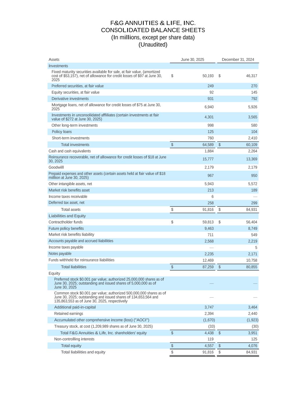 F&G ANNUITIES & LIFE, INC. CONSOLIDATED BALANCE SHEETS (In millions, except per share data) (Unaudited) Assets June 30, 2025 December 31, 2024 Investments Fixed maturity securities available for sale, at fair value, (amortized cost of $53,157), net of allowance for credit losses of $97 at June 30, 2025 $ 50,193 $ 46,317 Preferred securities, at fair value 249 270 Equity securities, at fair value 92 145 Derivative investments 931 792 Mortgage loans, net of allowance for credit losses of $75 at June 30, 2025 6,940 5,926 Investments in unconsolidated affiliates (certain investments at fair value of $272 at June 30, 2025) 4,301 3,565 Other long-term investments 998 580 Policy loans 125 104 Short-term investments 760 2,410 Total investments $ 64,589 $ 60,109 Cash and cash equivalents 1,884 2,264 Reinsurance recoverable, net of allowance for credit losses of $18 at June 30, 2025 15,777 13,369 Goodwill 2,179 2,179 Prepaid expenses and other assets (certain assets held at fair value of $18 million at June 30, 2025) 967 950 Other intangible assets, net 5,943 5,572 Market risk benefits asset 213 189 Income taxes receivable 6 — Deferred tax asset, net 258 299 Total assets $ 91,816 $ 84,931 Liabilities and Equity Contractholder funds $ 59,813 $ 56,404 Future policy benefits 9,463 8,749 Market risk benefits liability 711 549 Accounts payable and accrued liabilities 2,568 2,219 Income taxes payable — 5 Notes payable 2,235 2,171 Funds withheld for reinsurance liabilities 12,469 10,758 Total liabilities $ 87,259 $ 80,855 Equity Preferred stock $0.001 par value; authorized 25,000,000 shares as of June 30, 2025; outstanding and issued shares of 5,000,000 as of June 30, 2025 — — Common stock $0.001 par value; authorized 500,000,000 shares as of June 30, 2025; outstanding and issued shares of 134,653,564 and 135,863,553 as of June 30, 2025, respectively — — Additional paid-in-capital 3,747 3,464 Retained earnings 2,394 2,440 Accumulated other comprehensive income (loss) ("AOCI") (1,670) (1,923) Treasury stock, at cost (1,209,989 shares as of June 30, 2025) (33) (30) Total F&G Annuities & Life, Inc. shareholders' equity $ 4,438 $ 3,951 Non-controlling interests 119 125 Total equity $ 4,557 $ 4,076 Total liabilities and equity $ 91,816 $ 84,931