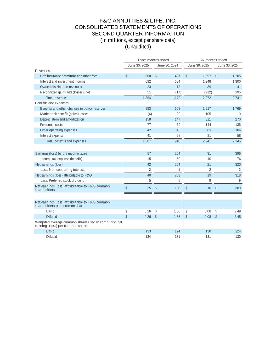 F&G ANNUITIES & LIFE, INC. CONSOLIDATED STATEMENTS OF OPERATIONS SECOND QUARTER INFORMATION (In millions, except per share data) (Unaudited) Three months ended Six months ended June 30, 2025 June 30, 2024 June 30, 2025 June 30, 2024 Revenues Life insurance premiums and other fees $ 608 $ 487 $ 1,097 $ 1,205 Interest and investment income 682 684 1,348 1,300 Owned distribution revenues 23 18 39 41 Recognized gains and (losses), net 51 (17) (212) 195 Total revenues 1,364 1,172 2,272 2,741 Benefits and expenses Benefits and other changes in policy reserves 993 608 1,517 1,769 Market risk benefit (gains) losses (4) 20 105 9 Depreciation and amortization 158 147 311 270 Personnel costs 77 69 144 135 Other operating expenses 42 46 83 104 Interest expense 41 28 81 58 Total benefits and expenses 1,307 918 2,241 2,345 Earnings (loss) before income taxes 57 254 31 396 Income tax expense (benefit) 15 50 10 76 Net earnings (loss) 42 204 21 320 Less: Non-controlling interests 2 1 2 2 Net earnings (loss) attributable to F&G 40 203 19 318 Less: Preferred stock dividend 5 5 9 9 Net earnings (loss) attributable to F&G common shareholders $ 35 $ 198 $ 10 $ 309 Net earnings (loss) attributable to F&G common shareholders per common share Basic $ 0.26 $ 1.60 $ 0.08 $ 2.49 Diluted $ 0.26 $ 1.55 $ 0.08 $ 2.45 Weighted average common shares used in computing net earnings (loss) per common share Basic 133 124 130 124 Diluted 134 131 131 130