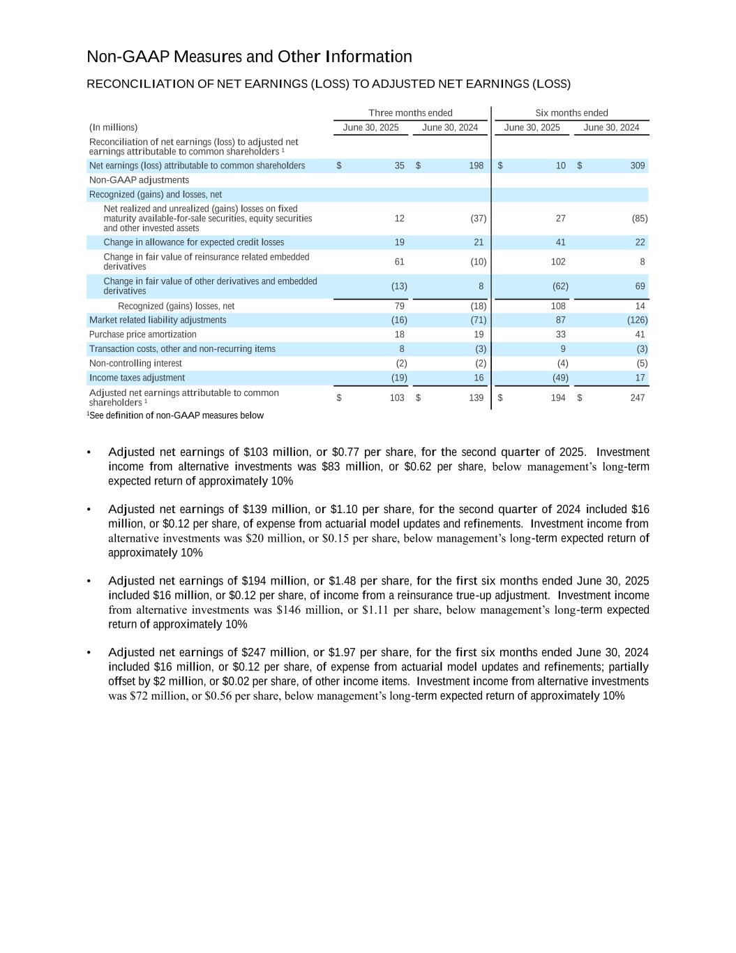 Non-GAAP Measures and Other Information RECONCILIATION OF NET EARNINGS (LOSS) TO ADJUSTED NET EARNINGS (LOSS) Three months ended Six months ended (In millions) June 30, 2025 June 30, 2024 June 30, 2025 June 30, 2024 Reconciliation of net earnings (loss) to adjusted net earnings attributable to common shareholders ¹ Net earnings (loss) attributable to common shareholders $ 35 $ 198 $ 10 $ 309 Non-GAAP adjustments Recognized (gains) and losses, net Net realized and unrealized (gains) losses on fixed maturity available-for-sale securities, equity securities and other invested assets 12 (37) 27 (85) Change in allowance for expected credit losses 19 21 41 22 Change in fair value of reinsurance related embedded derivatives 61 (10) 102 8 Change in fair value of other derivatives and embedded derivatives (13) 8 (62) 69 Recognized (gains) losses, net 79 (18) 108 14 Market related liability adjustments (16) (71) 87 (126) Purchase price amortization 18 19 33 41 Transaction costs, other and non-recurring items 8 (3) 9 (3) Non-controlling interest (2) (2) (4) (5) Income taxes adjustment (19) 16 (49) 17 Adjusted net earnings attributable to common shareholders ¹ $ 103 $ 139 $ 194 $ 247 1See definition of non-GAAP measures below • Adjusted net earnings of $103 million, or $0.77 per share, for the second quarter of 2025. Investment income from alternative investments was $83 million, or $0.62 per share, below management’s long-term expected return of approximately 10% • Adjusted net earnings of $139 million, or $1.10 per share, for the second quarter of 2024 included $16 million, or $0.12 per share, of expense from actuarial model updates and refinements. Investment income from alternative investments was $20 million, or $0.15 per share, below management’s long-term expected return of approximately 10% • Adjusted net earnings of $194 million, or $1.48 per share, for the first six months ended June 30, 2025 included $16 million, or $0.12 per share, of income from a reinsurance true-up adjustment. Investment income from alternative investments was $146 million, or $1.11 per share, below management’s long-term expected return of approximately 10% • Adjusted net earnings of $247 million, or $1.97 per share, for the first six months ended June 30, 2024 included $16 million, or $0.12 per share, of expense from actuarial model updates and refinements; partially offset by $2 million, or $0.02 per share, of other income items. Investment income from alternative investments was $72 million, or $0.56 per share, below management’s long-term expected return of approximately 10%