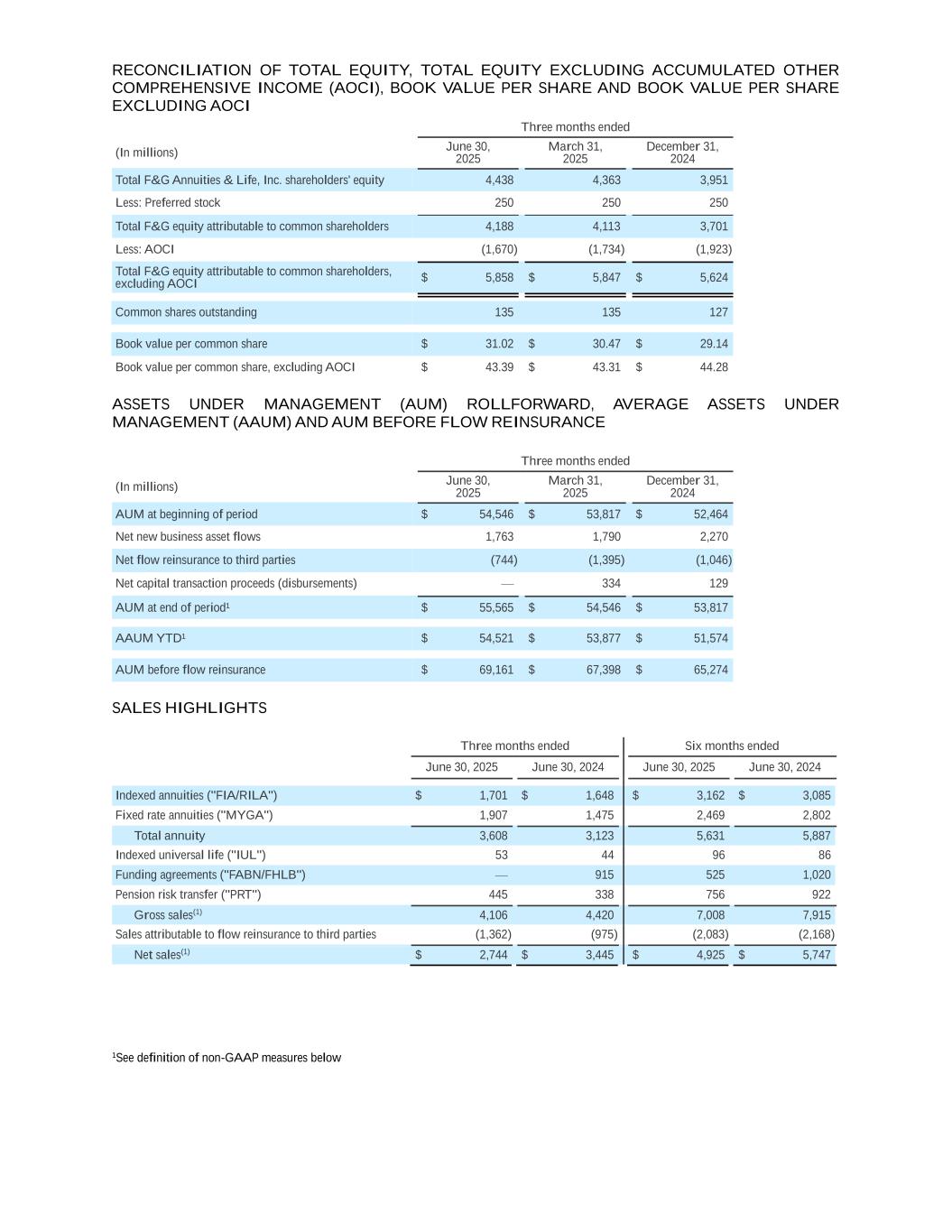 RECONCILIATION OF TOTAL EQUITY, TOTAL EQUITY EXCLUDING ACCUMULATED OTHER COMPREHENSIVE INCOME (AOCI), BOOK VALUE PER SHARE AND BOOK VALUE PER SHARE EXCLUDING AOCI Three months ended (In millions) June 30, 2025 March 31, 2025 December 31, 2024 Total F&G Annuities & Life, Inc. shareholders' equity 4,438 4,363 3,951 Less: Preferred stock 250 250 250 Total F&G equity attributable to common shareholders 4,188 4,113 3,701 Less: AOCI (1,670) (1,734) (1,923) Total F&G equity attributable to common shareholders, excluding AOCI $ 5,858 $ 5,847 $ 5,624 Common shares outstanding 135 135 127 Book value per common share $ 31.02 $ 30.47 $ 29.14 Book value per common share, excluding AOCI $ 43.39 $ 43.31 $ 44.28 ASSETS UNDER MANAGEMENT (AUM) ROLLFORWARD, AVERAGE ASSETS UNDER MANAGEMENT (AAUM) AND AUM BEFORE FLOW REINSURANCE Three months ended (In millions) June 30, 2025 March 31, 2025 December 31, 2024 AUM at beginning of period $ 54,546 $ 53,817 $ 52,464 Net new business asset flows 1,763 1,790 2,270 Net flow reinsurance to third parties (744) (1,395) (1,046) Net capital transaction proceeds (disbursements) — 334 129 AUM at end of period¹ $ 55,565 $ 54,546 $ 53,817 AAUM YTD¹ $ 54,521 $ 53,877 $ 51,574 AUM before flow reinsurance $ 69,161 $ 67,398 $ 65,274 SALES HIGHLIGHTS Three months ended Six months ended June 30, 2025 June 30, 2024 June 30, 2025 June 30, 2024 Indexed annuities ("FIA/RILA") $ 1,701 $ 1,648 $ 3,162 $ 3,085 Fixed rate annuities ("MYGA") 1,907 1,475 2,469 2,802 Total annuity 3,608 3,123 5,631 5,887 Indexed universal life ("IUL") 53 44 96 86 Funding agreements ("FABN/FHLB") — 915 525 1,020 Pension risk transfer ("PRT") 445 338 756 922 Gross sales(1) 4,106 4,420 7,008 7,915 Sales attributable to flow reinsurance to third parties (1,362) (975) (2,083) (2,168) Net sales(1) $ 2,744 $ 3,445 $ 4,925 $ 5,747 1See definition of non-GAAP measures below