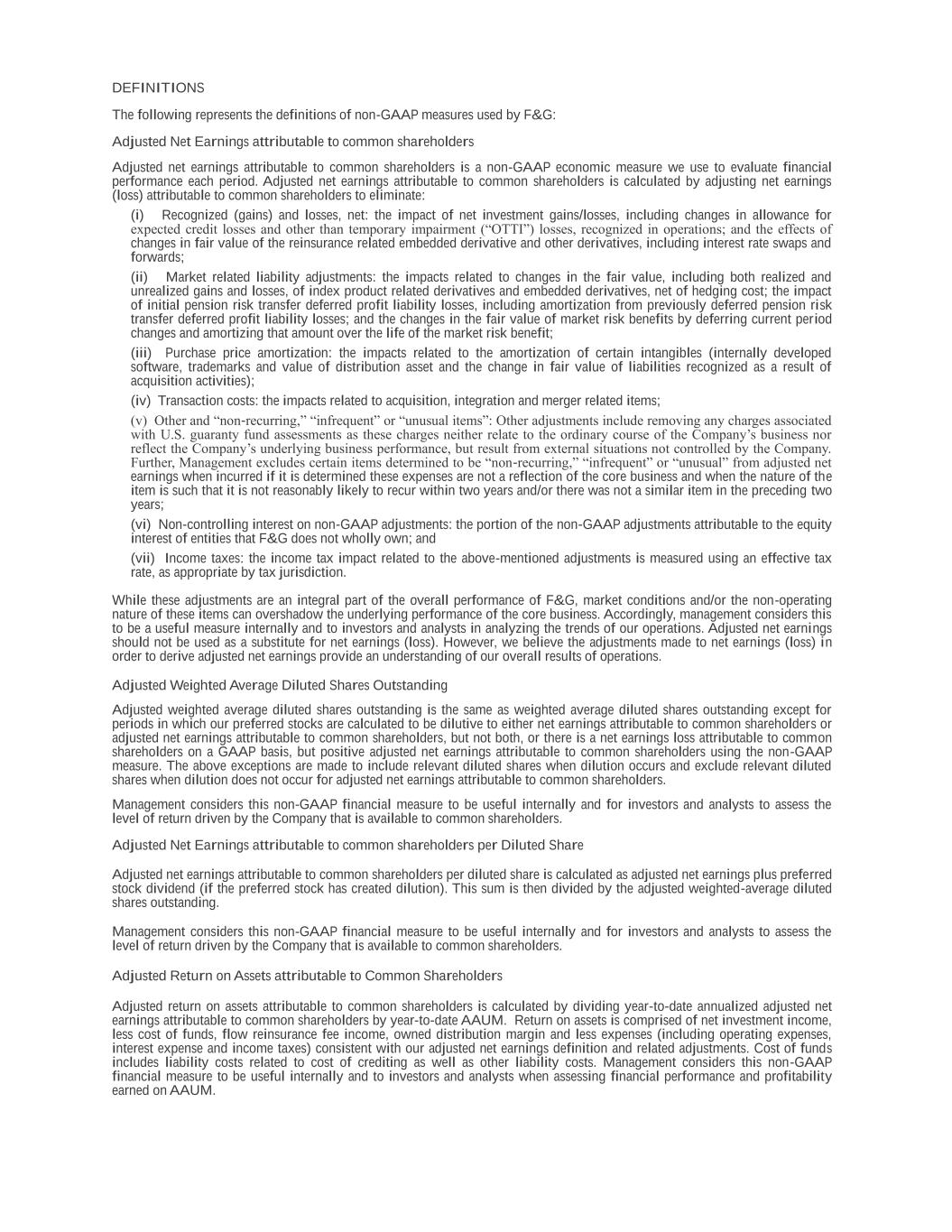 DEFINITIONS The following represents the definitions of non-GAAP measures used by F&G: Adjusted Net Earnings attributable to common shareholders Adjusted net earnings attributable to common shareholders is a non-GAAP economic measure we use to evaluate financial performance each period. Adjusted net earnings attributable to common shareholders is calculated by adjusting net earnings (loss) attributable to common shareholders to eliminate: (i) Recognized (gains) and losses, net: the impact of net investment gains/losses, including changes in allowance for expected credit losses and other than temporary impairment (“OTTI”) losses, recognized in operations; and the effects of changes in fair value of the reinsurance related embedded derivative and other derivatives, including interest rate swaps and forwards; (ii) Market related liability adjustments: the impacts related to changes in the fair value, including both realized and unrealized gains and losses, of index product related derivatives and embedded derivatives, net of hedging cost; the impact of initial pension risk transfer deferred profit liability losses, including amortization from previously deferred pension risk transfer deferred profit liability losses; and the changes in the fair value of market risk benefits by deferring current period changes and amortizing that amount over the life of the market risk benefit; (iii) Purchase price amortization: the impacts related to the amortization of certain intangibles (internally developed software, trademarks and value of distribution asset and the change in fair value of liabilities recognized as a result of acquisition activities); (iv) Transaction costs: the impacts related to acquisition, integration and merger related items; (v) Other and “non-recurring,” “infrequent” or “unusual items”: Other adjustments include removing any charges associated with U.S. guaranty fund assessments as these charges neither relate to the ordinary course of the Company’s business nor reflect the Company’s underlying business performance, but result from external situations not controlled by the Company. Further, Management excludes certain items determined to be “non-recurring,” “infrequent” or “unusual” from adjusted net earnings when incurred if it is determined these expenses are not a reflection of the core business and when the nature of the item is such that it is not reasonably likely to recur within two years and/or there was not a similar item in the preceding two years; (vi) Non-controlling interest on non-GAAP adjustments: the portion of the non-GAAP adjustments attributable to the equity interest of entities that F&G does not wholly own; and (vii) Income taxes: the income tax impact related to the above-mentioned adjustments is measured using an effective tax rate, as appropriate by tax jurisdiction. While these adjustments are an integral part of the overall performance of F&G, market conditions and/or the non-operating nature of these items can overshadow the underlying performance of the core business. Accordingly, management considers this to be a useful measure internally and to investors and analysts in analyzing the trends of our operations. Adjusted net earnings should not be used as a substitute for net earnings (loss). However, we believe the adjustments made to net earnings (loss) in order to derive adjusted net earnings provide an understanding of our overall results of operations. Adjusted Weighted Average Diluted Shares Outstanding Adjusted weighted average diluted shares outstanding is the same as weighted average diluted shares outstanding except for periods in which our preferred stocks are calculated to be dilutive to either net earnings attributable to common shareholders or adjusted net earnings attributable to common shareholders, but not both, or there is a net earnings loss attributable to common shareholders on a GAAP basis, but positive adjusted net earnings attributable to common shareholders using the non-GAAP measure. The above exceptions are made to include relevant diluted shares when dilution occurs and exclude relevant diluted shares when dilution does not occur for adjusted net earnings attributable to common shareholders. Management considers this non-GAAP financial measure to be useful internally and for investors and analysts to assess the level of return driven by the Company that is available to common shareholders. Adjusted Net Earnings attributable to common shareholders per Diluted Share Adjusted net earnings attributable to common shareholders per diluted share is calculated as adjusted net earnings plus preferred stock dividend (if the preferred stock has created dilution). This sum is then divided by the adjusted weighted-average diluted shares outstanding. Management considers this non-GAAP financial measure to be useful internally and for investors and analysts to assess the level of return driven by the Company that is available to common shareholders. Adjusted Return on Assets attributable to Common Shareholders Adjusted return on assets attributable to common shareholders is calculated by dividing year-to-date annualized adjusted net earnings attributable to common shareholders by year-to-date AAUM. Return on assets is comprised of net investment income, less cost of funds, flow reinsurance fee income, owned distribution margin and less expenses (including operating expenses, interest expense and income taxes) consistent with our adjusted net earnings definition and related adjustments. Cost of funds includes liability costs related to cost of crediting as well as other liability costs. Management considers this non-GAAP financial measure to be useful internally and to investors and analysts when assessing financial performance and profitability earned on AAUM.
