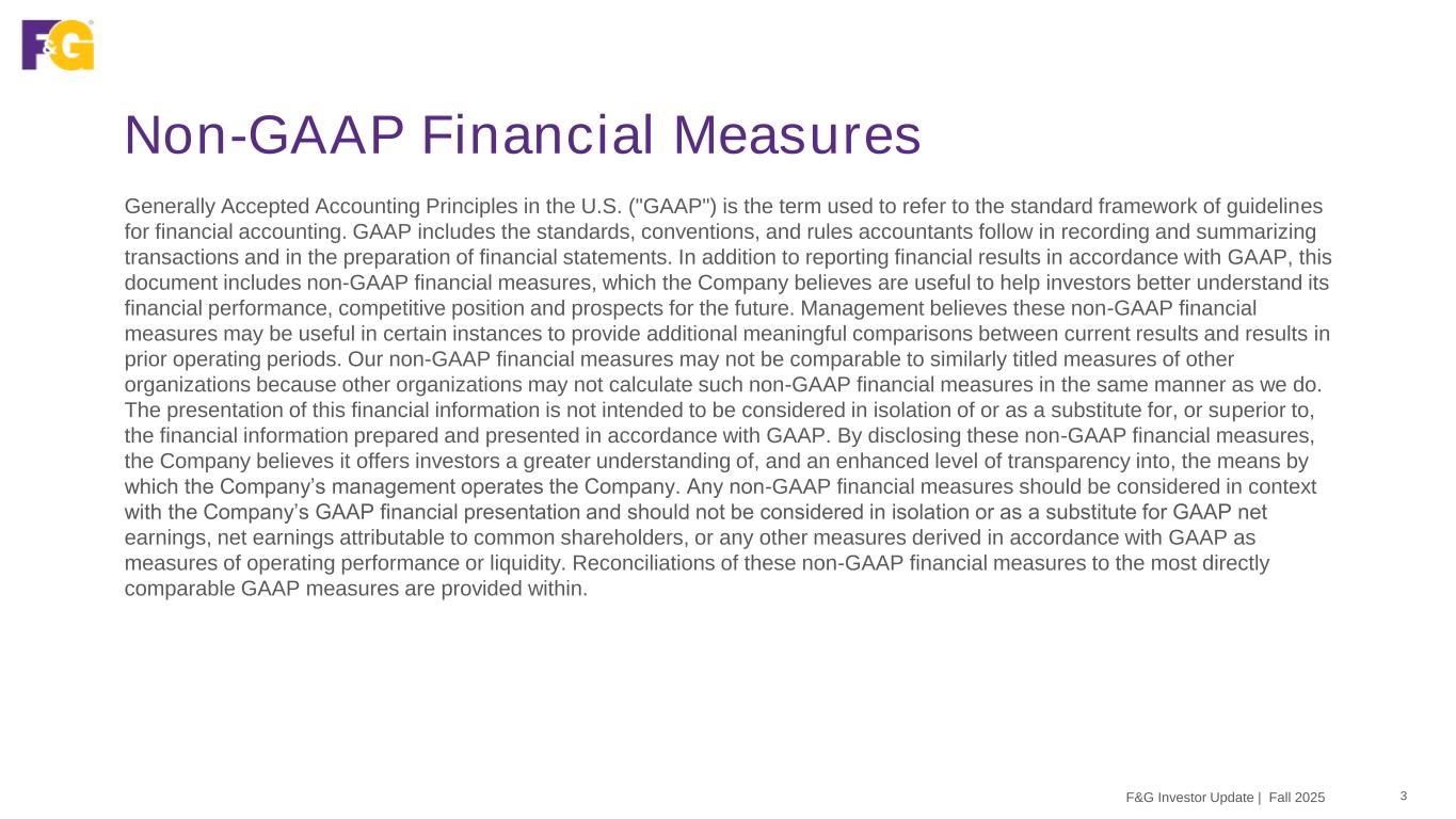 Non-GAAP Financial Measures 3F&G Investor Update | Fall 2025 Generally Accepted Accounting Principles in the U.S. ("GAAP") is the term used to refer to the standard framework of guidelines for financial accounting. GAAP includes the standards, conventions, and rules accountants follow in recording and summarizing transactions and in the preparation of financial statements. In addition to reporting financial results in accordance with GAAP, this document includes non-GAAP financial measures, which the Company believes are useful to help investors better understand its financial performance, competitive position and prospects for the future. Management believes these non-GAAP financial measures may be useful in certain instances to provide additional meaningful comparisons between current results and results in prior operating periods. Our non-GAAP financial measures may not be comparable to similarly titled measures of other organizations because other organizations may not calculate such non-GAAP financial measures in the same manner as we do. The presentation of this financial information is not intended to be considered in isolation of or as a substitute for, or superior to, the financial information prepared and presented in accordance with GAAP. By disclosing these non-GAAP financial measures, the Company believes it offers investors a greater understanding of, and an enhanced level of transparency into, the means by which the Company’s management operates the Company. Any non-GAAP financial measures should be considered in context with the Company’s GAAP financial presentation and should not be considered in isolation or as a substitute for GAAP net earnings, net earnings attributable to common shareholders, or any other measures derived in accordance with GAAP as measures of operating performance or liquidity. Reconciliations of these non-GAAP financial measures to the most directly comparable GAAP measures are provided within.