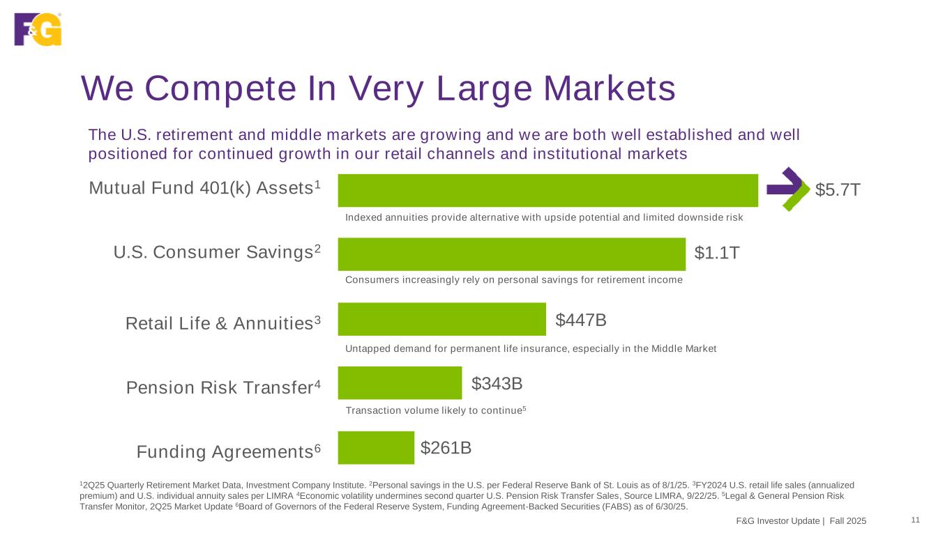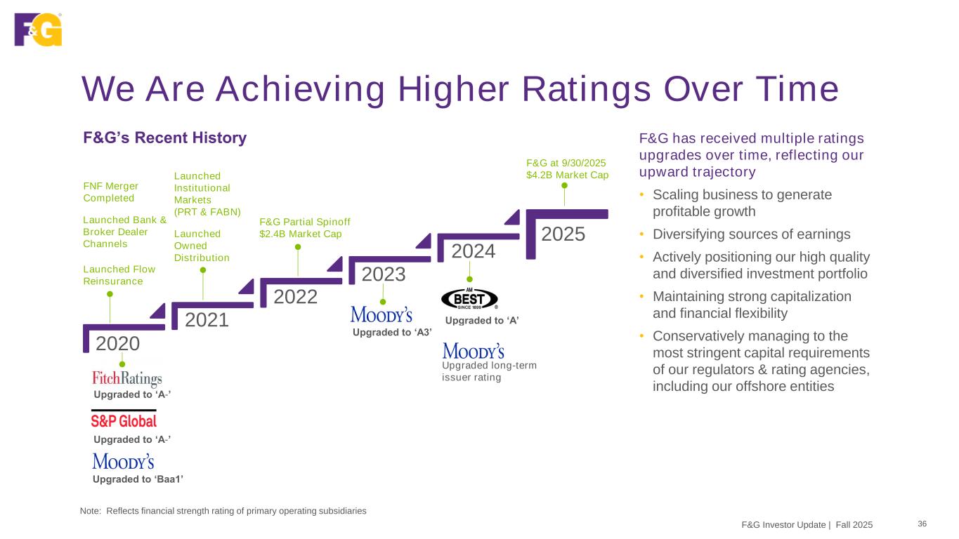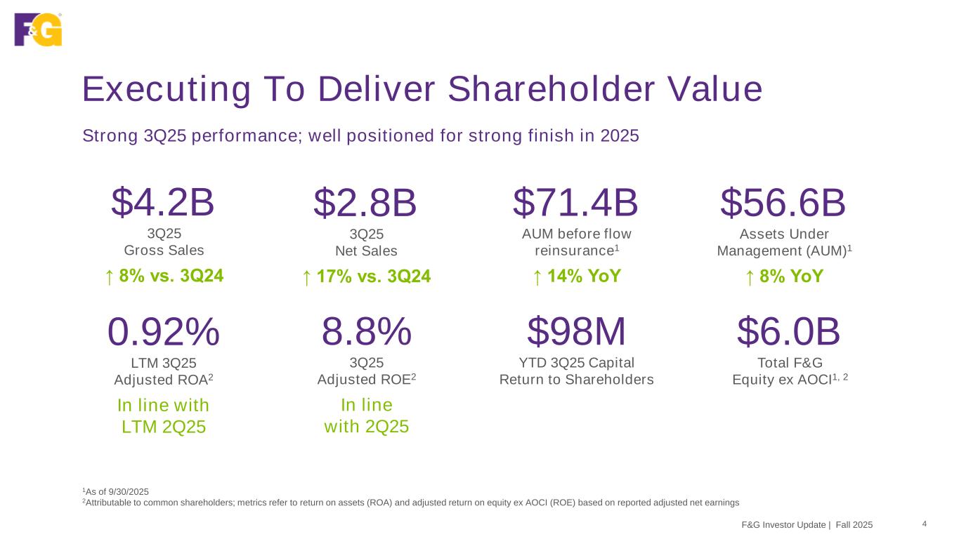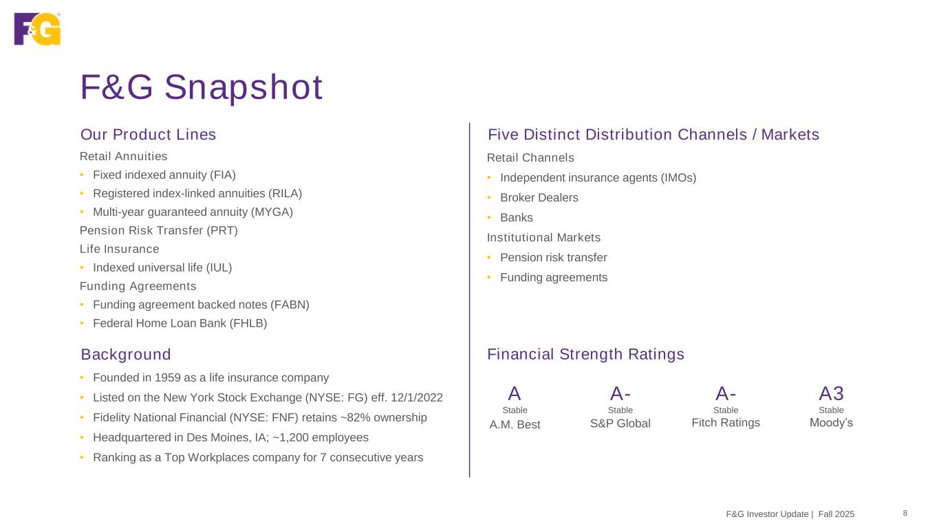 Disclaimer & Forward-Looking Statements 2F&G Investor Update | Fall 2025 This presentation contains forward-looking statements that are subject to known and unknown risks and uncertainties, many of which are beyond our control. Some of the forward-looking statements can be identified by the use of terms such as “believes”, “expects”, “may”, “will”, “could”, “seeks”, “intends”, “plans”, “estimates”, “anticipates” or other comparable terms. Statements that are not historical facts, including statements regarding our expectations, hopes, intentions or strategies regarding the future are forward-looking statements. Forward-looking statements are based on management's beliefs, as well as assumptions made by, and information currently available to, management. Because such statements are based on expectations as to future financial and operating results and are not statements of fact, actual results may differ materially from those projected. We undertake no obligation to update any forward-looking statements, whether as a result of new information, future events or otherwise. The risks and uncertainties which forward-looking statements are subject to include, but are not limited to: general economic conditions and other factors, including prevailing interest and unemployment rate levels and stock and credit market performance; consumer spending; government spending; the volatility and strength of the capital markets; investor and consumer confidence; foreign currency exchange rates; commodity prices; inflation levels; changes in trade policy; tariffs and trade sanctions on goods; trade wars; supply chain disruptions; natural disasters, public health crises, international tensions and conflicts, geopolitical events, terrorist acts, labor strikes, political crisis, accidents and other events; concentration in certain states for distribution of our products; the impact of interest rate fluctuations; equity market volatility or disruption; the impact of credit risk of our counterparties; changes in our assumptions and estimates regarding amortization of our deferred acquisition costs, deferred sales inducements and value of business acquired balances; regulatory changes or actions, including those relating to regulation of financial services affecting (among other things) underwriting of insurance products and regulation of the sale, underwriting and pricing of products and minimum capitalization and statutory reserve requirements for insurance companies, or the ability of our insurance subsidiaries to make cash distributions to us; and other factors discussed in “Risk Factors” and other sections of F&G's Form 10-K and other filings with the Securities and Exchange Commission (SEC).